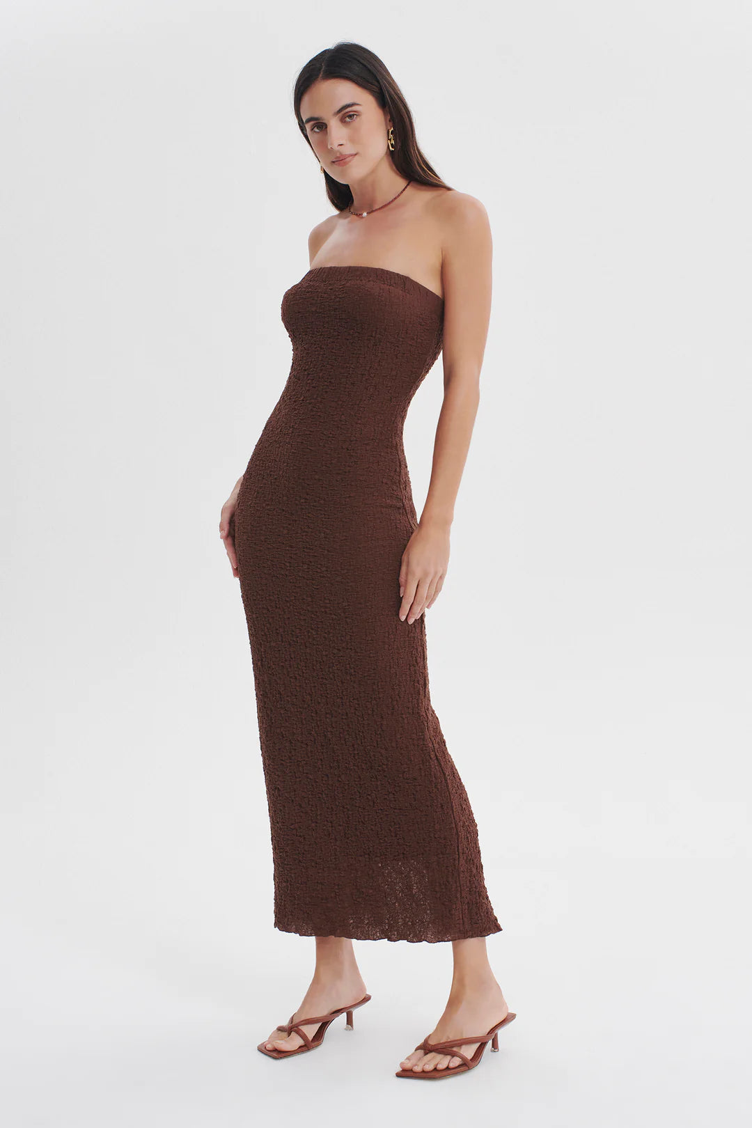 The Petra Dress is the figure-flattering midi style cut in a high stretch textured cotton blend fabrication. The strapless style is semi-fitted with a back split for movement. This is a Lulu & Daw favourite - perfect for every Summer wardrobe.
