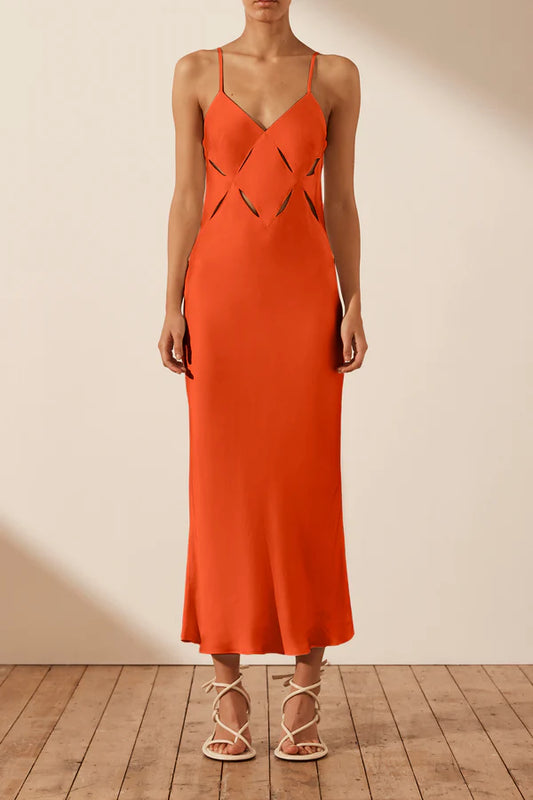 Shona Joy Mia Contrast Plunged Double Strap Midi Dress - Red Orange / Hibiscus