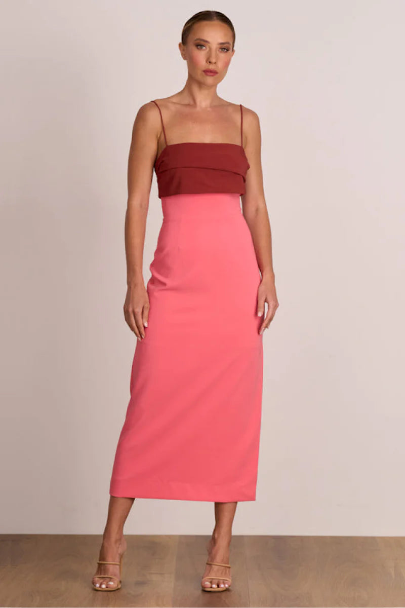 The Ace Contrast Midi is made from a stretch twill suiting. Sitting firmly through the square cut bodice and suspended by barley straps allowing horizontal tucks to create shape and fit over the bust accented by the contrast overlay The column silhouette then dominates skimming the hip before falling to the long length midi.