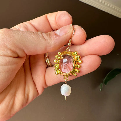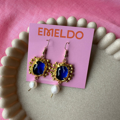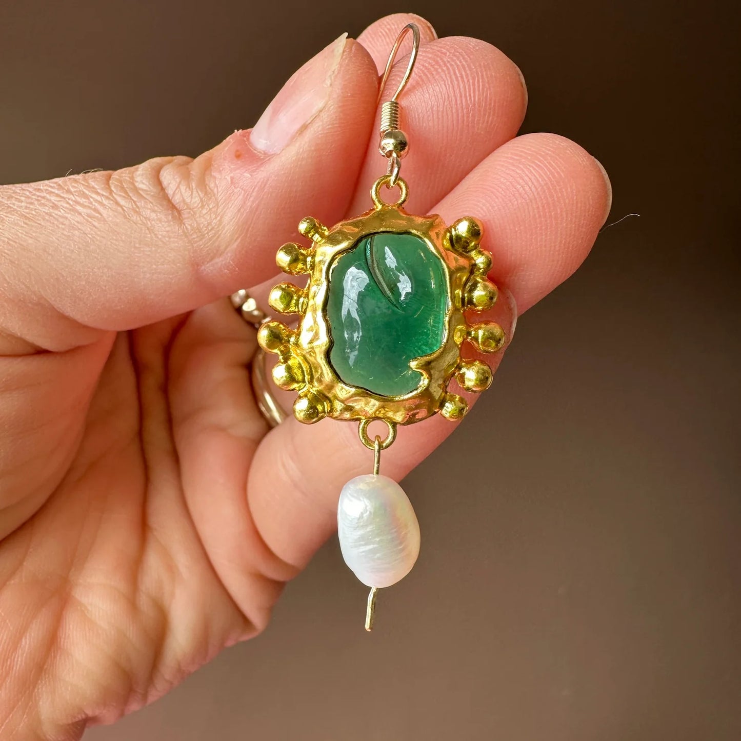 These are the perfect glam earrings, great for formal events and dressing up any outfits. Lightweight acrylic stone in brass (gold coloured coating) note these are not made of real silver or gold they have a pearl bead at the bottom. Handmade in studio in rye.