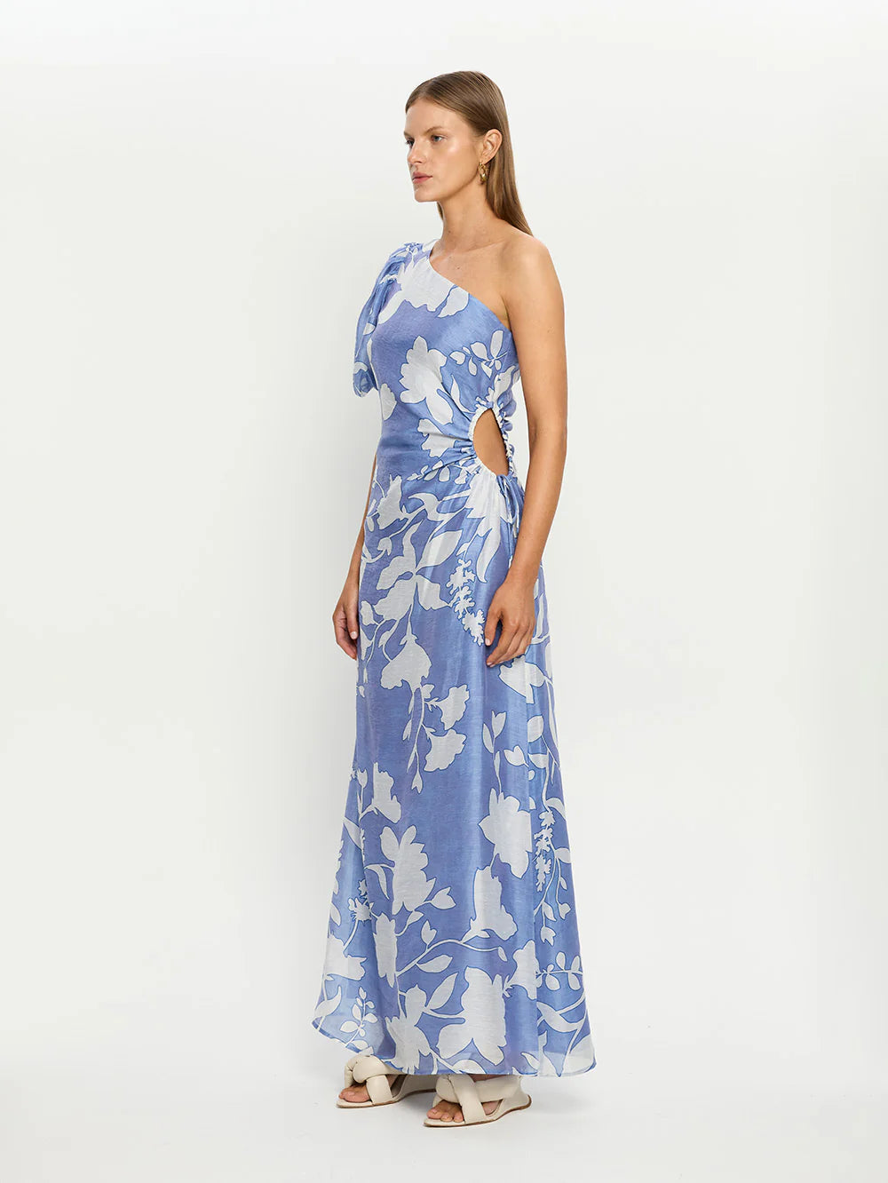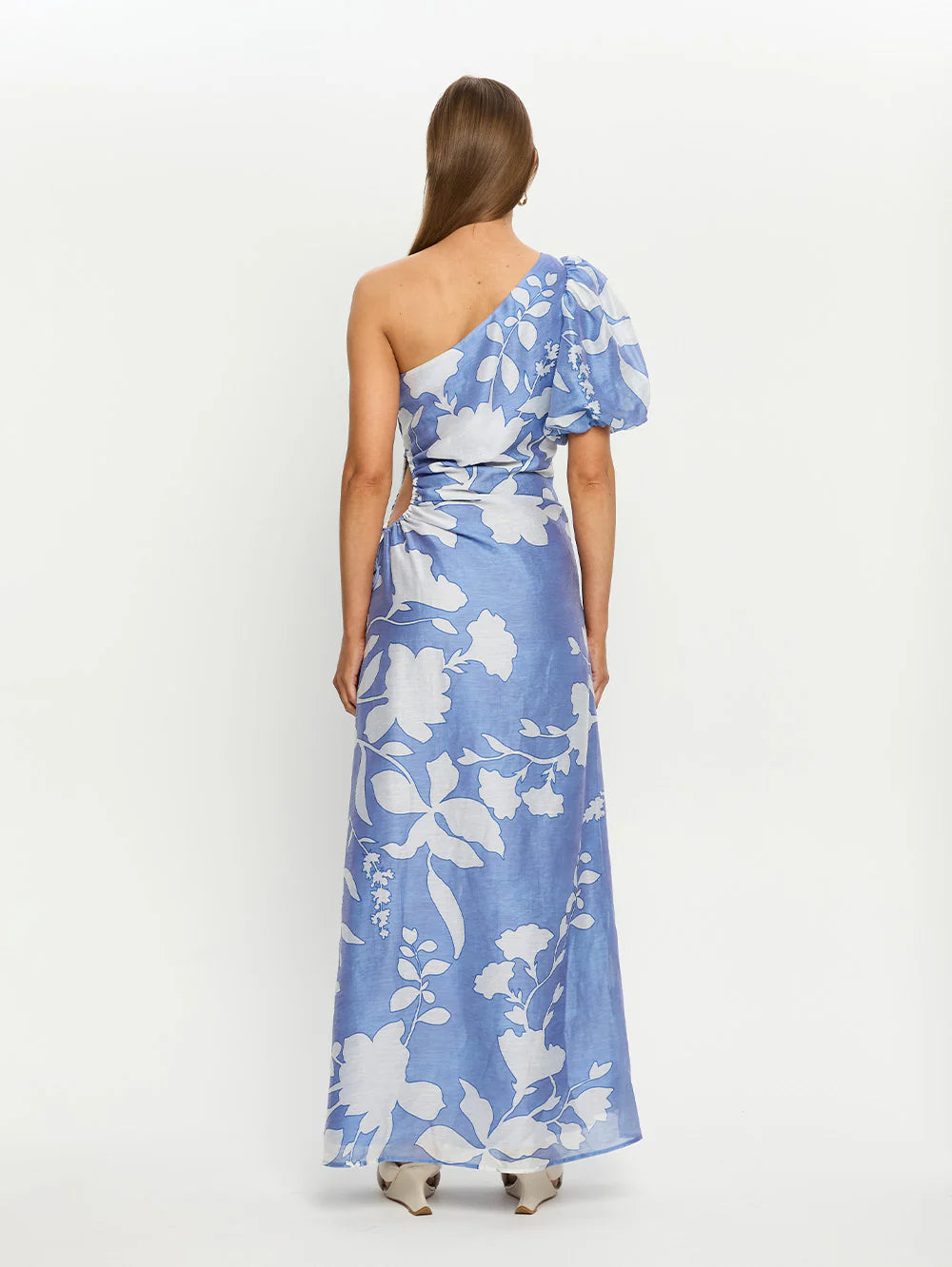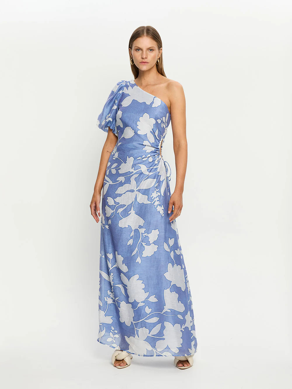 Amelie is intricate soft ivory florals on a cornflower blue base. The Amelie One Shoulder Maxi Dress features an asymmetrical neckline, slightly flared hem, complete with a bubble sleeve.