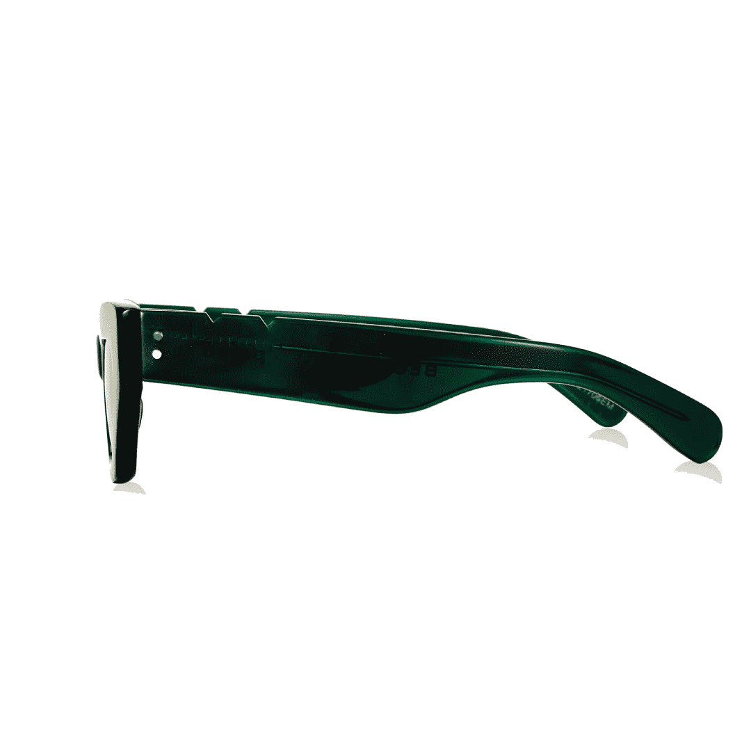 A thick rimmed all acetate frame features circular metal rivet detailing on the front of the frame and arm as well as signature pared eyewear notches on each arm.