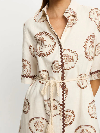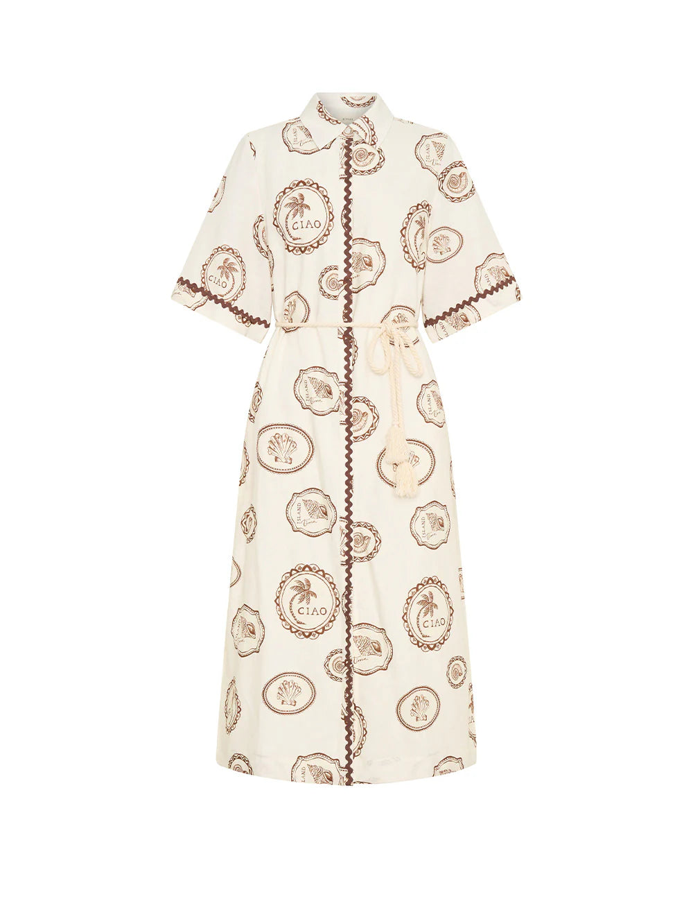 Ciao is hand sketched shells and coastal inspired stamps on a soft ivory base. The Ciao Midi Shirt Dress is a relaxed shirt silhouette featuring contrast detailing down the centre front and sleeves, complete with a removable tassle waist tie.