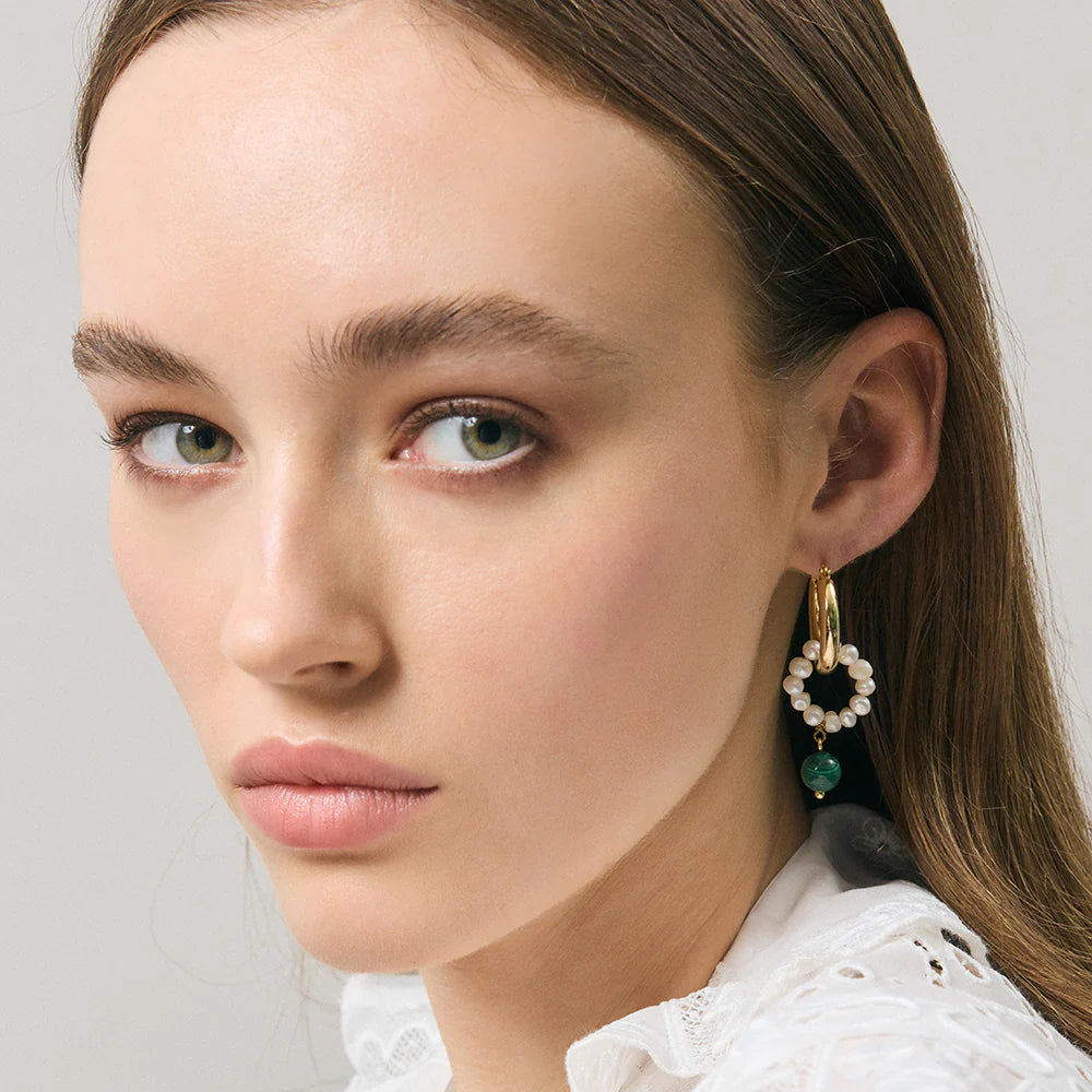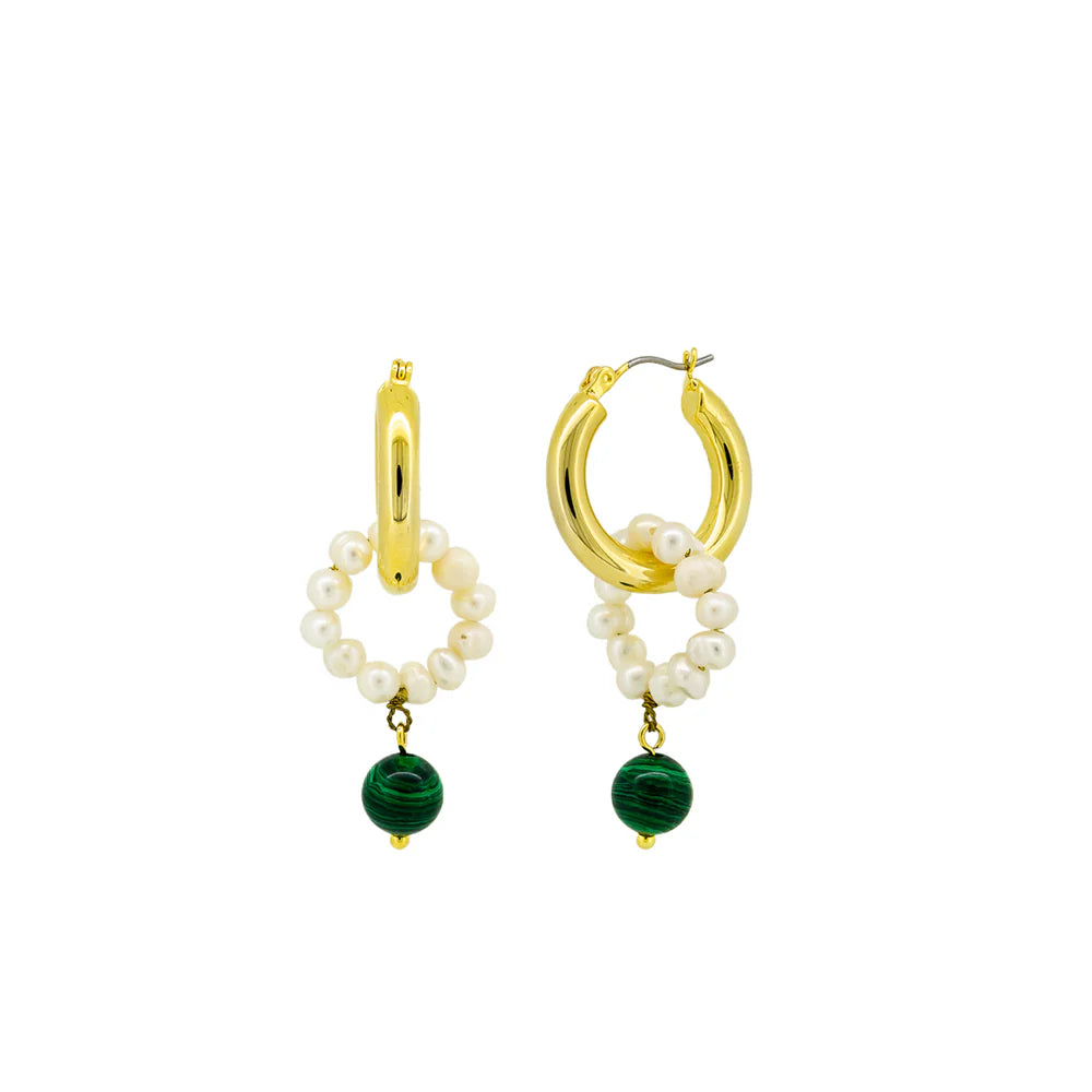The Gwendolyn Earrings are sure to catch anyone's eye. They feature a ring of pearls hanging from a chunky gold hoop, and a marble green ball hanging from the pearls.