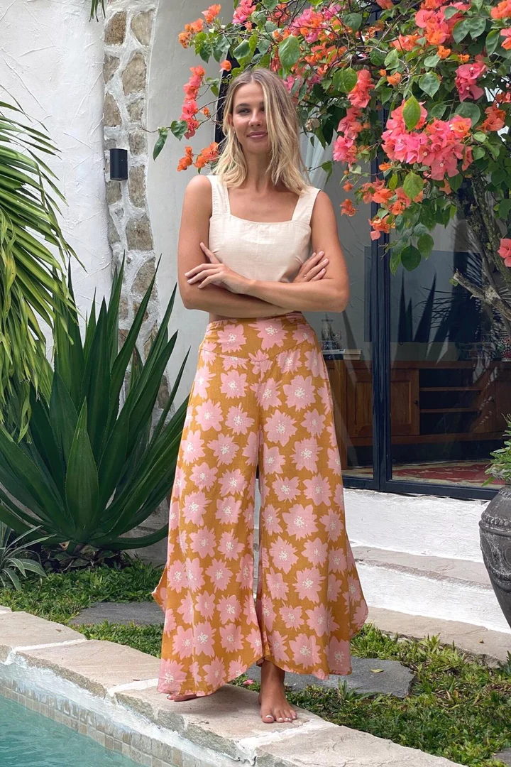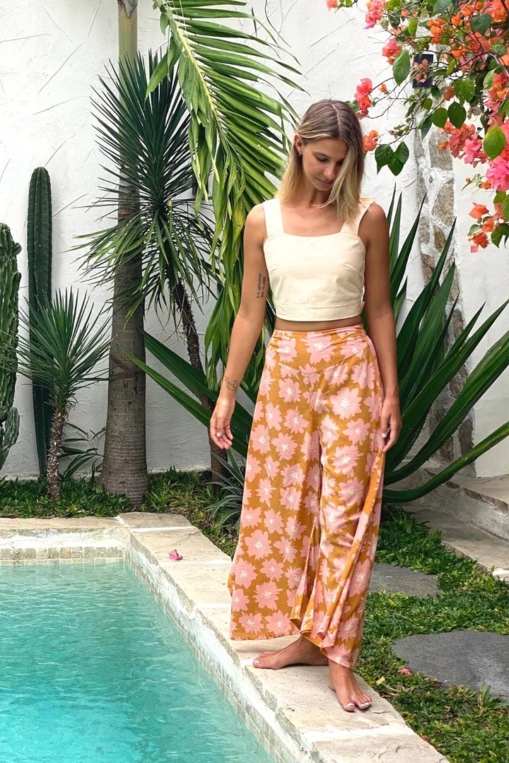 Wide legged pants with an elastic back for extra comfort. Can be worn high waisted or on hips.