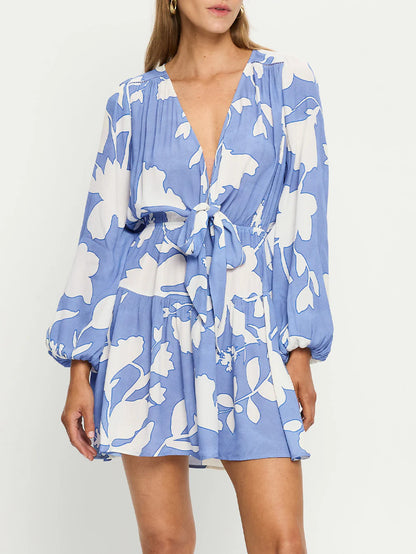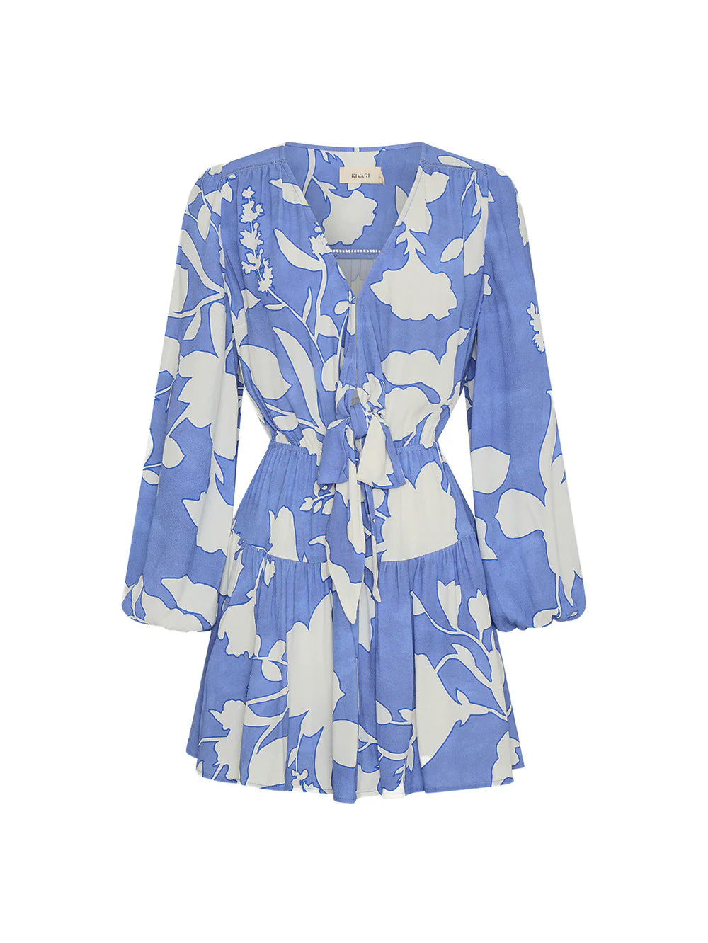 Amelie is intricate soft ivory florals on a cornflower blue base. The Amelie Tie Front Mini Dress features a tie front bodice, blouson sleeves. complete with a gathered frill hem.