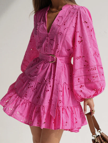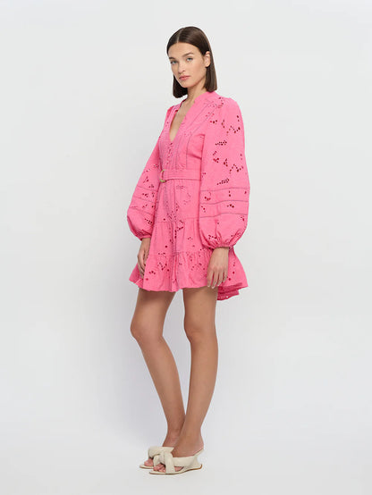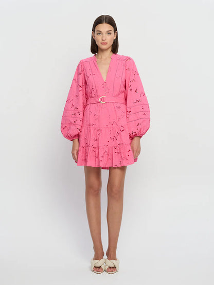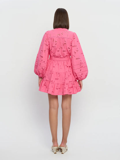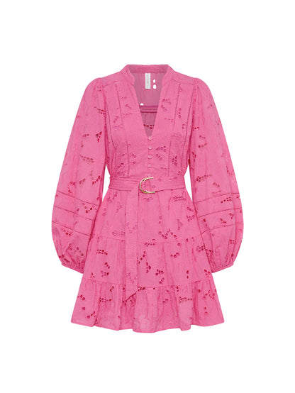 The Corfu Mini in a fuchsia hue is crafted from 100% Cotton Broderie. Featuring a button-through bodice with lace edging, full-length blouson sleeves, a gathered tiered hem and adjustable D-ring gold belt .