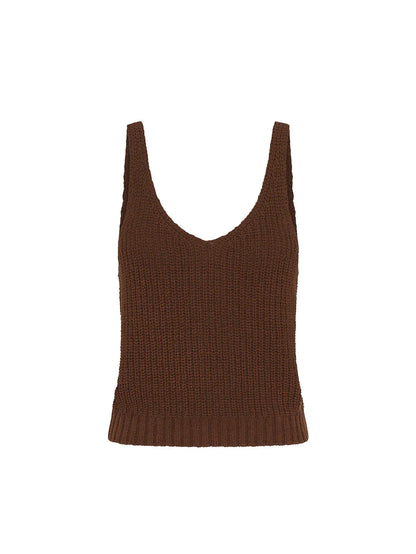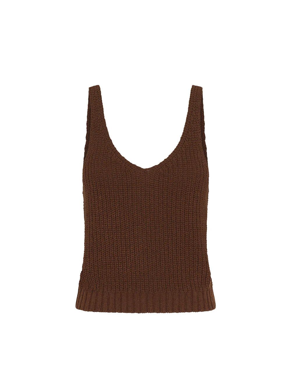The Lana Knit Cami in a chocolate hue features a soft textured yarn, v neckline, complete with a ribbed hemline.