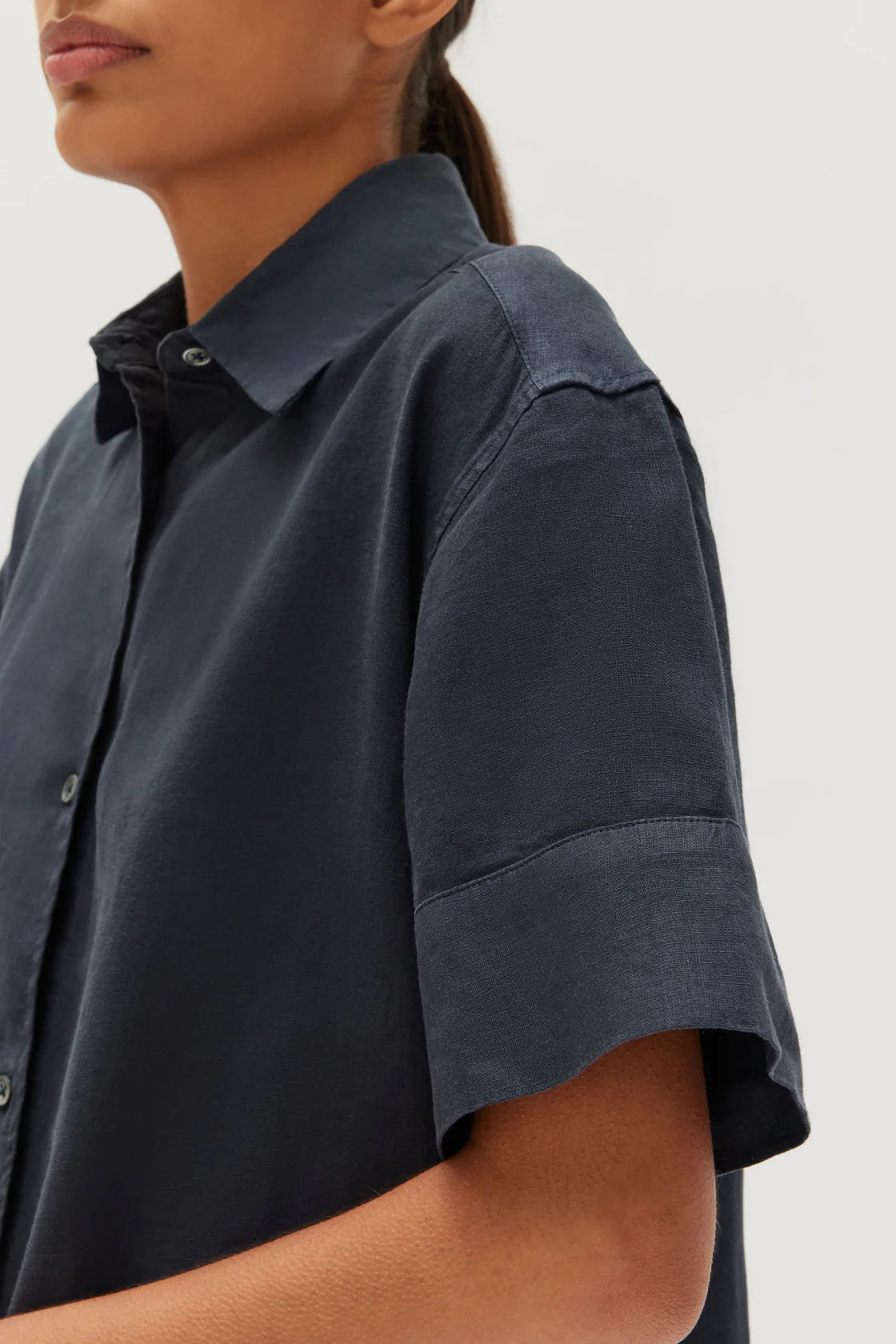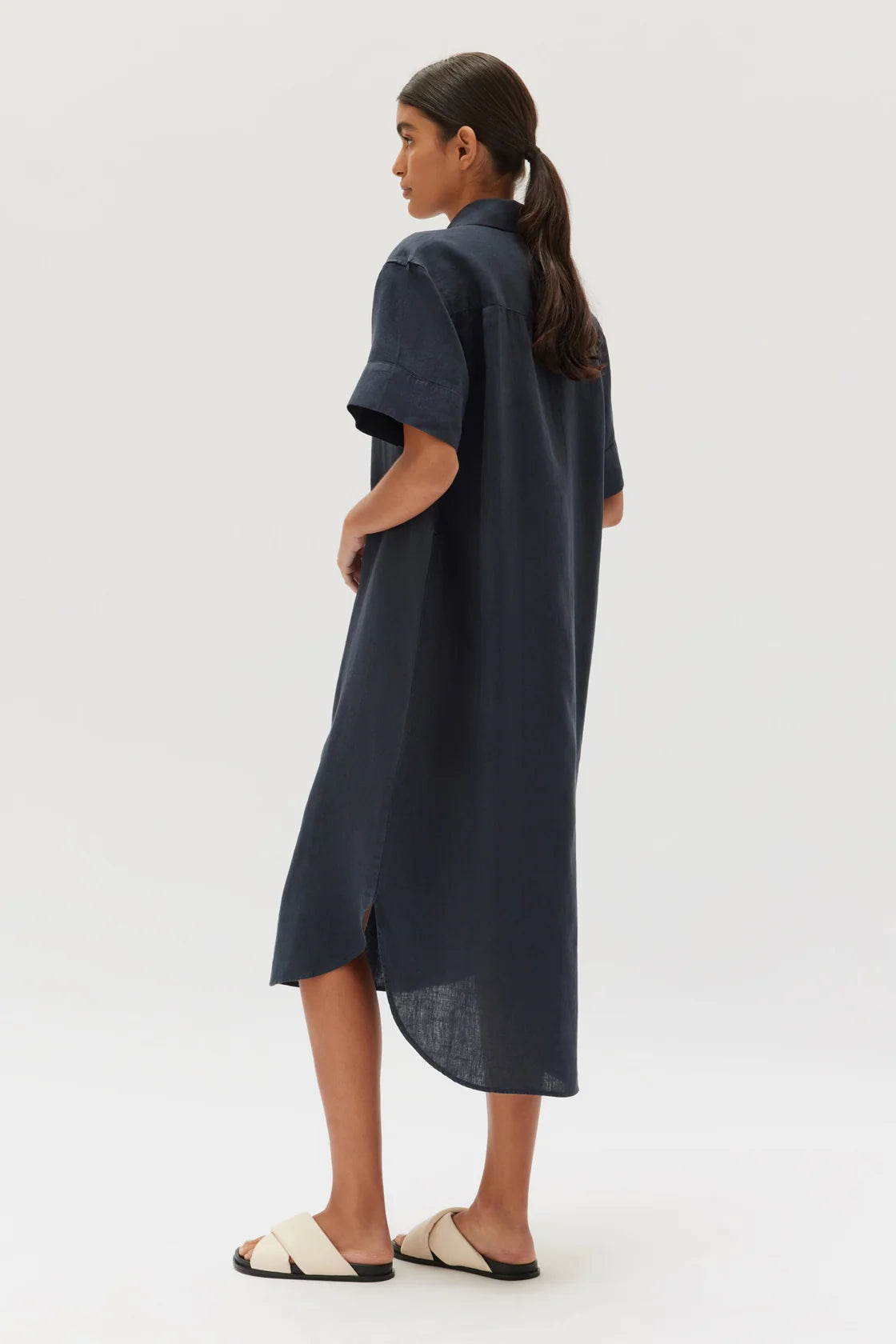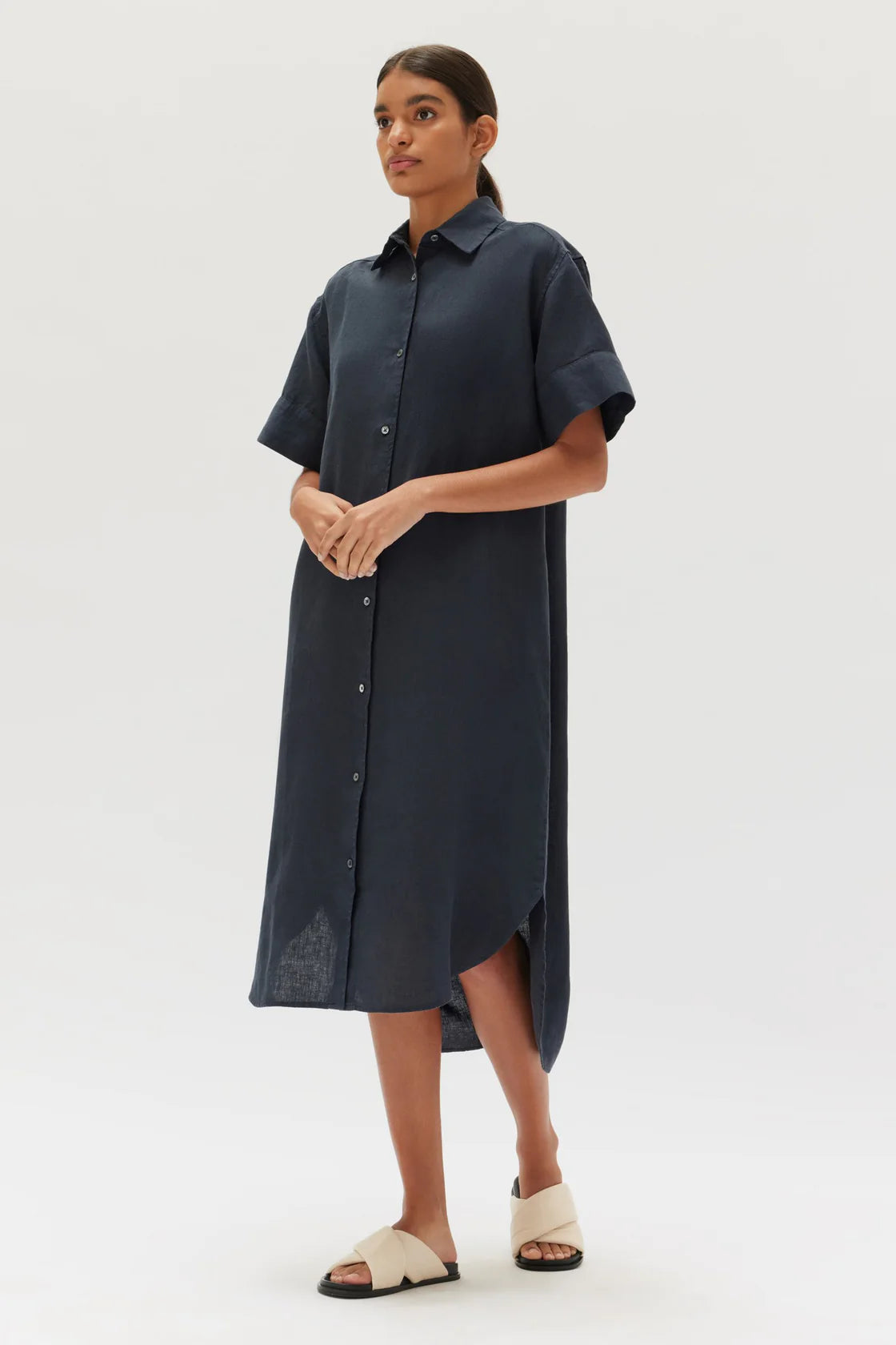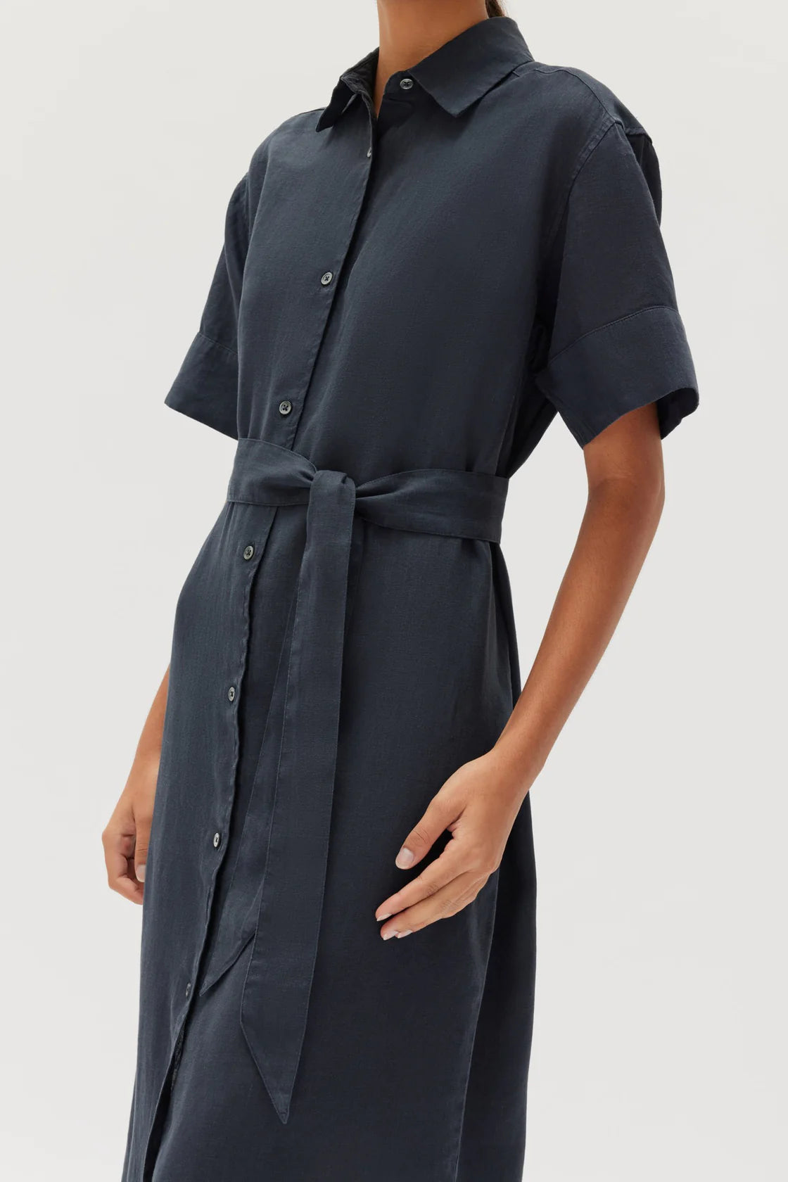 The Linen Shirt Dress is an effortless capsule wardrobe essential. This shirt dress has a relaxed fit with an optional waist tie that allows you to create your desired silhouette. It also features a collar, short wide sleeves, buttons through the front and a curved midi-length hemline.