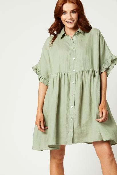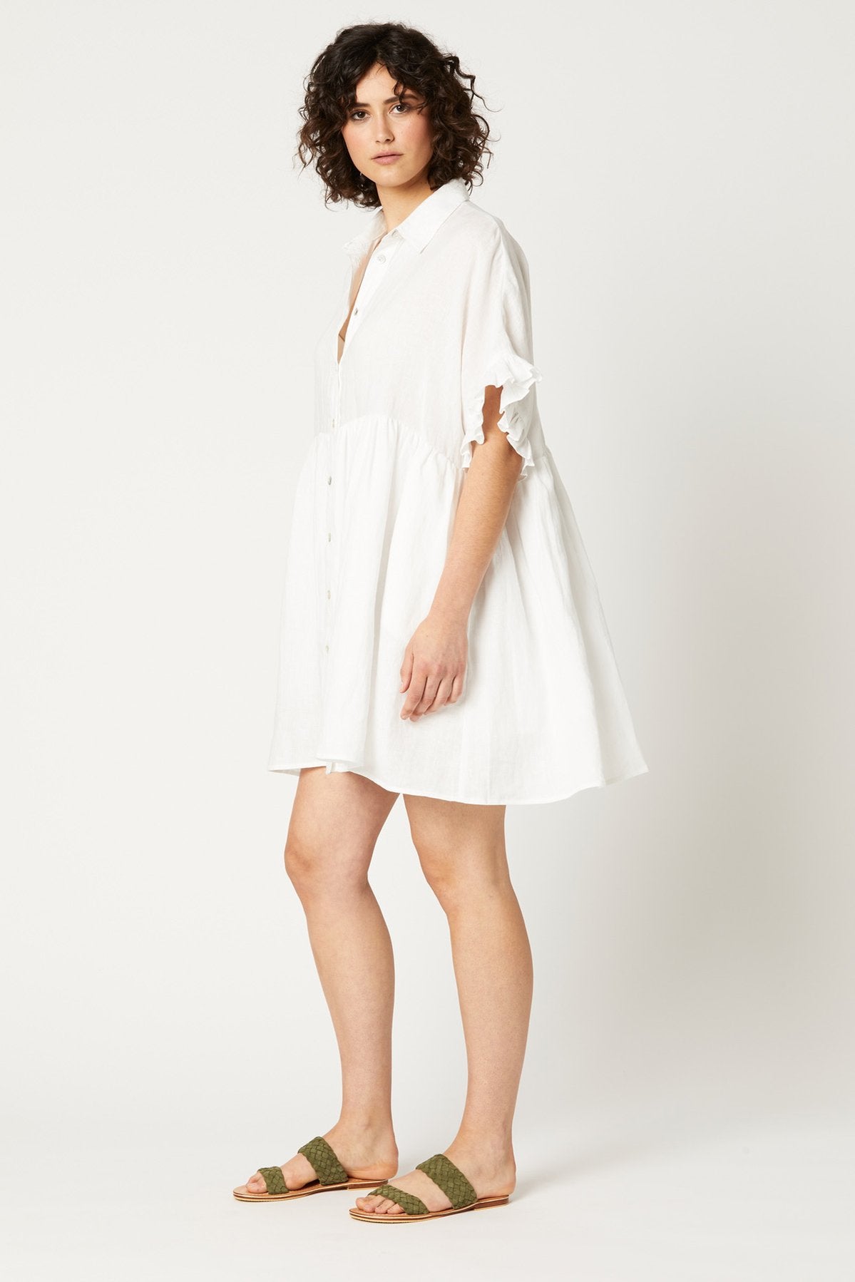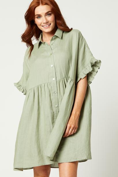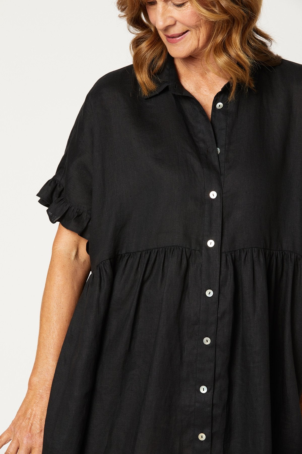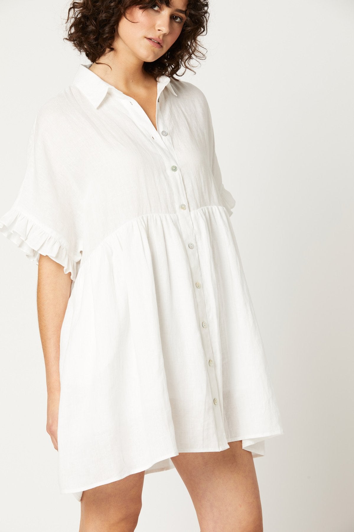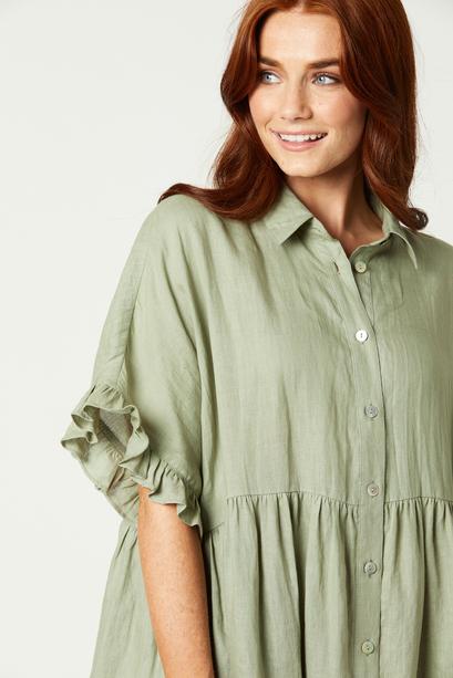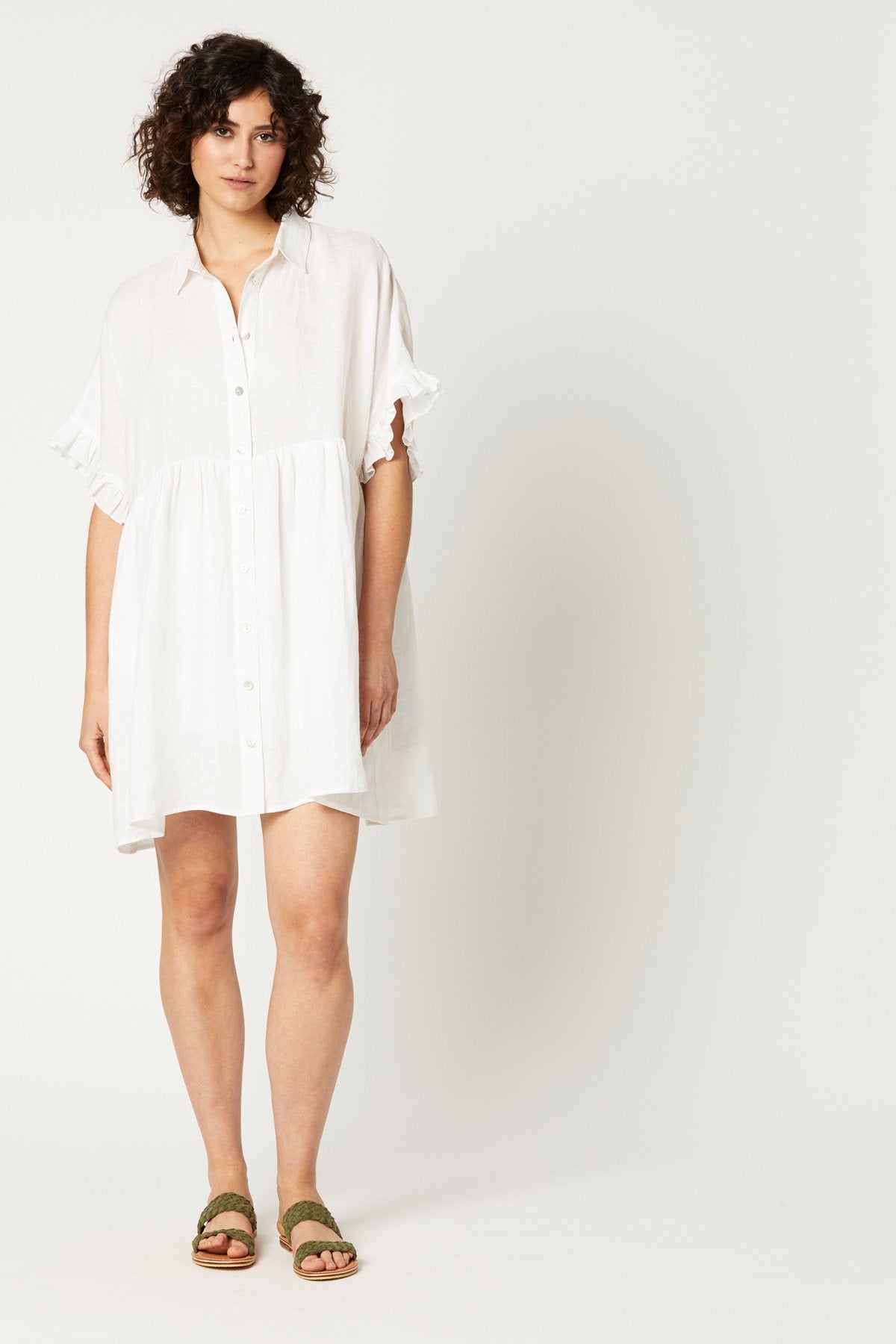 Crafted from 100% linen, the Nala Shirt Top/Dress is fully lined and designed with comfort, versatility, and flare in mind! The one-sized relaxed fit is inclusive of most body types. This button-down shirt style top/dress is single-tiered and features a collar and mid-length ruffled sleeves.
