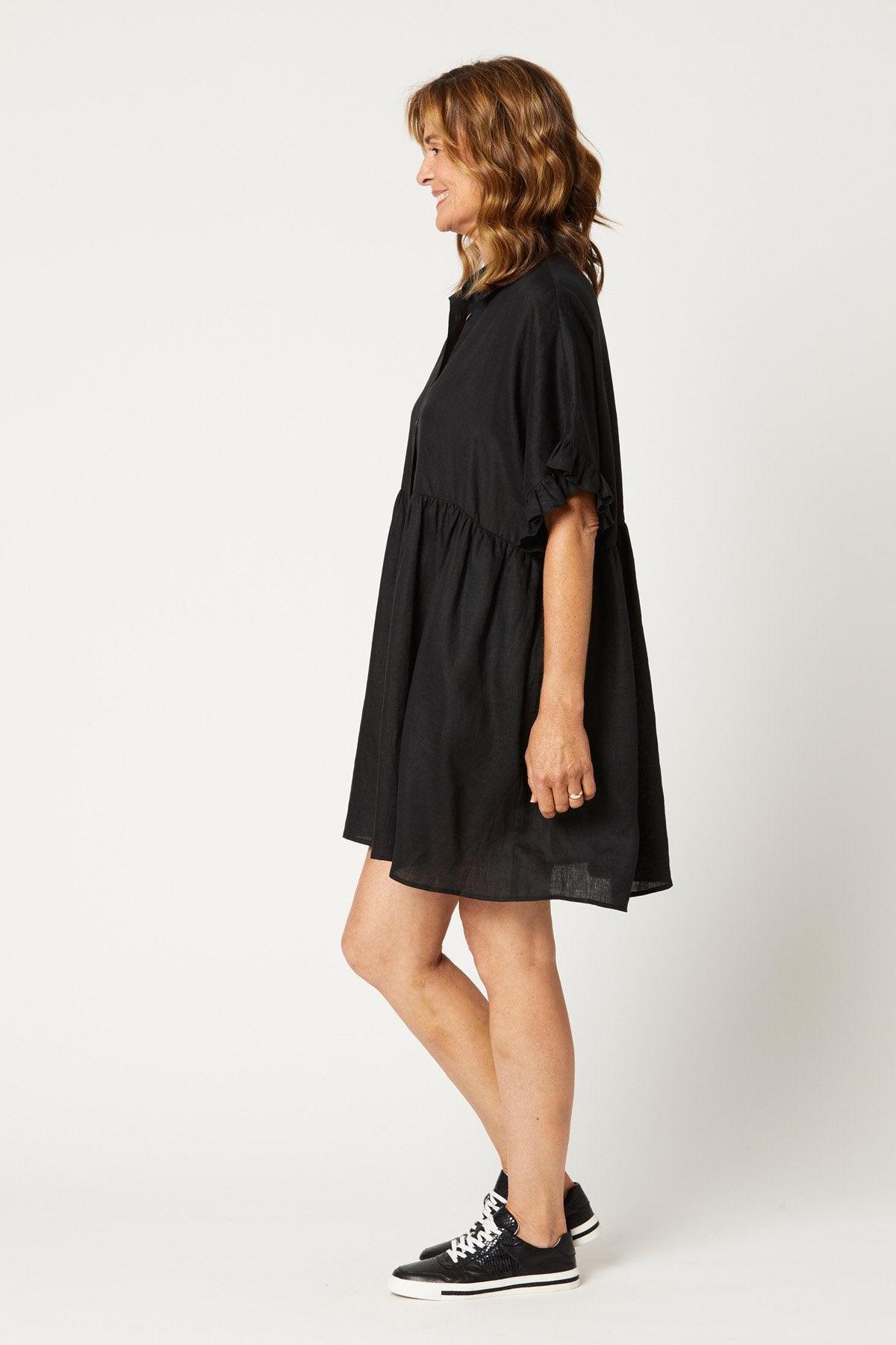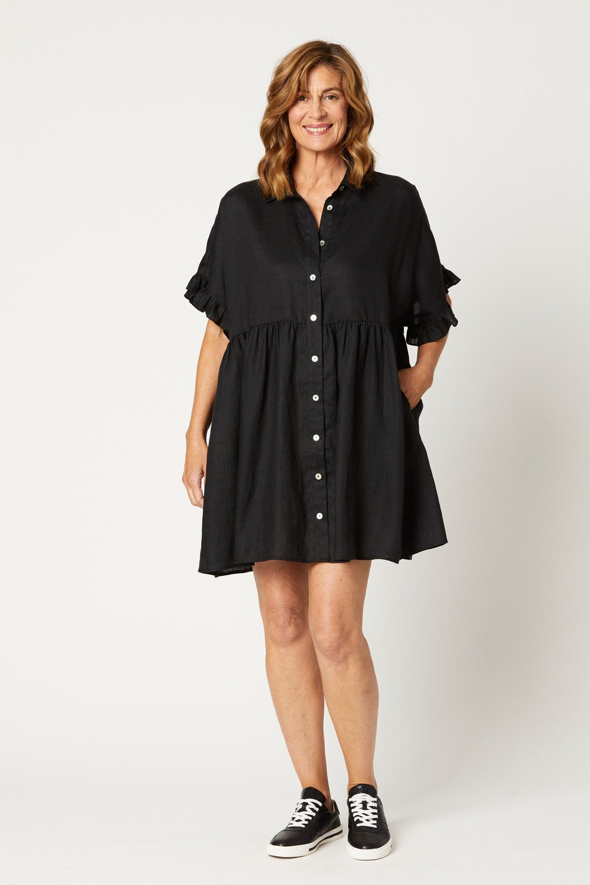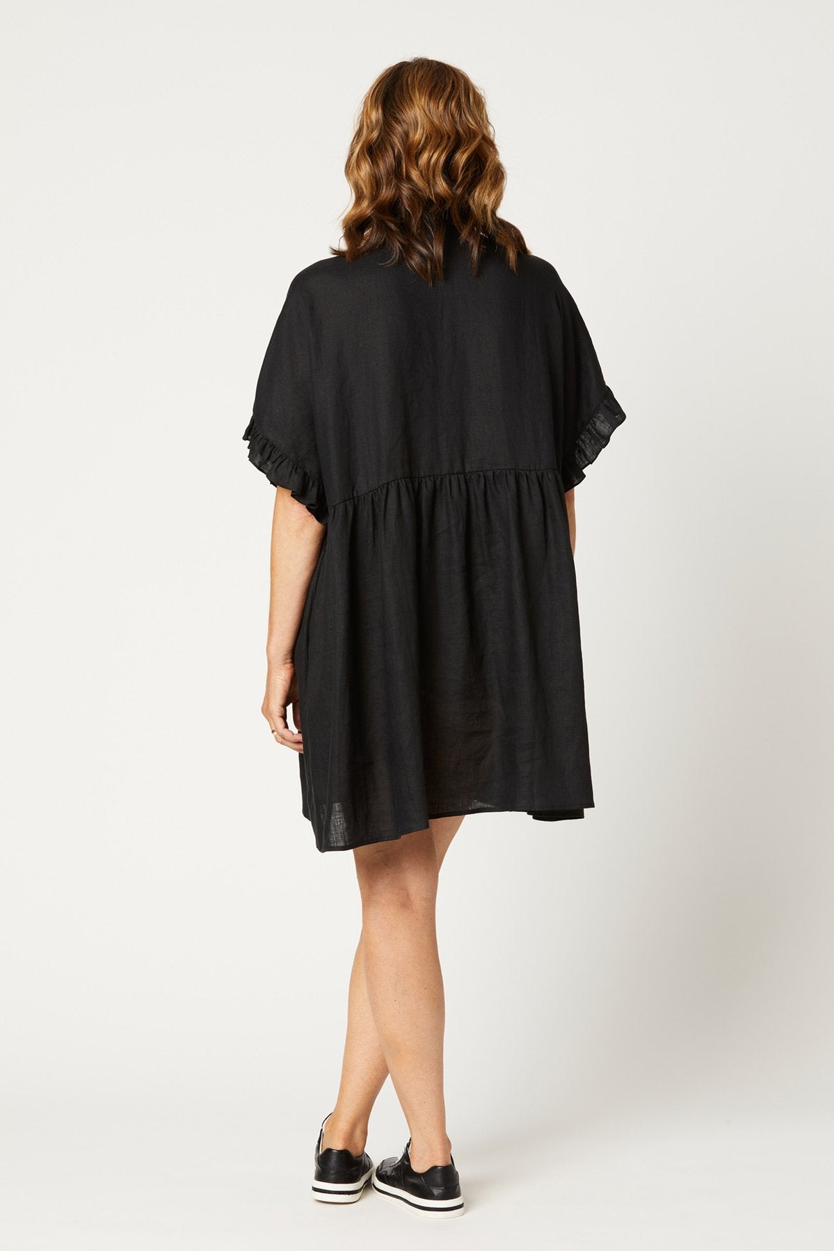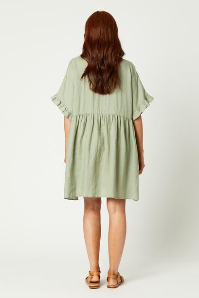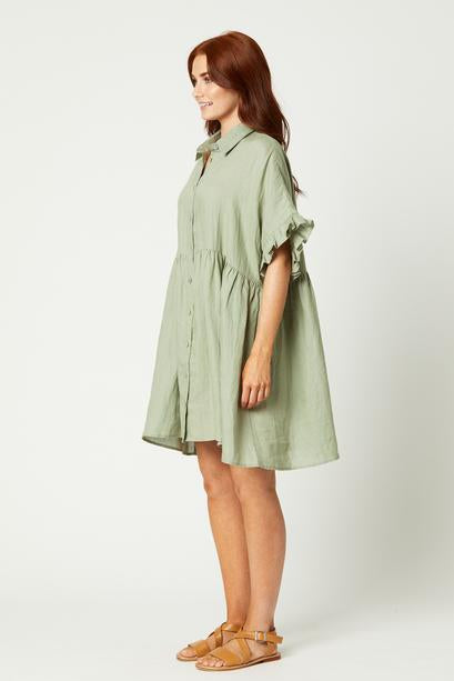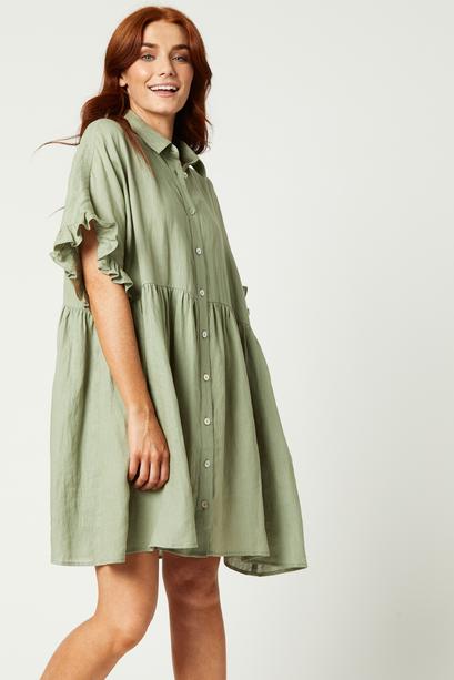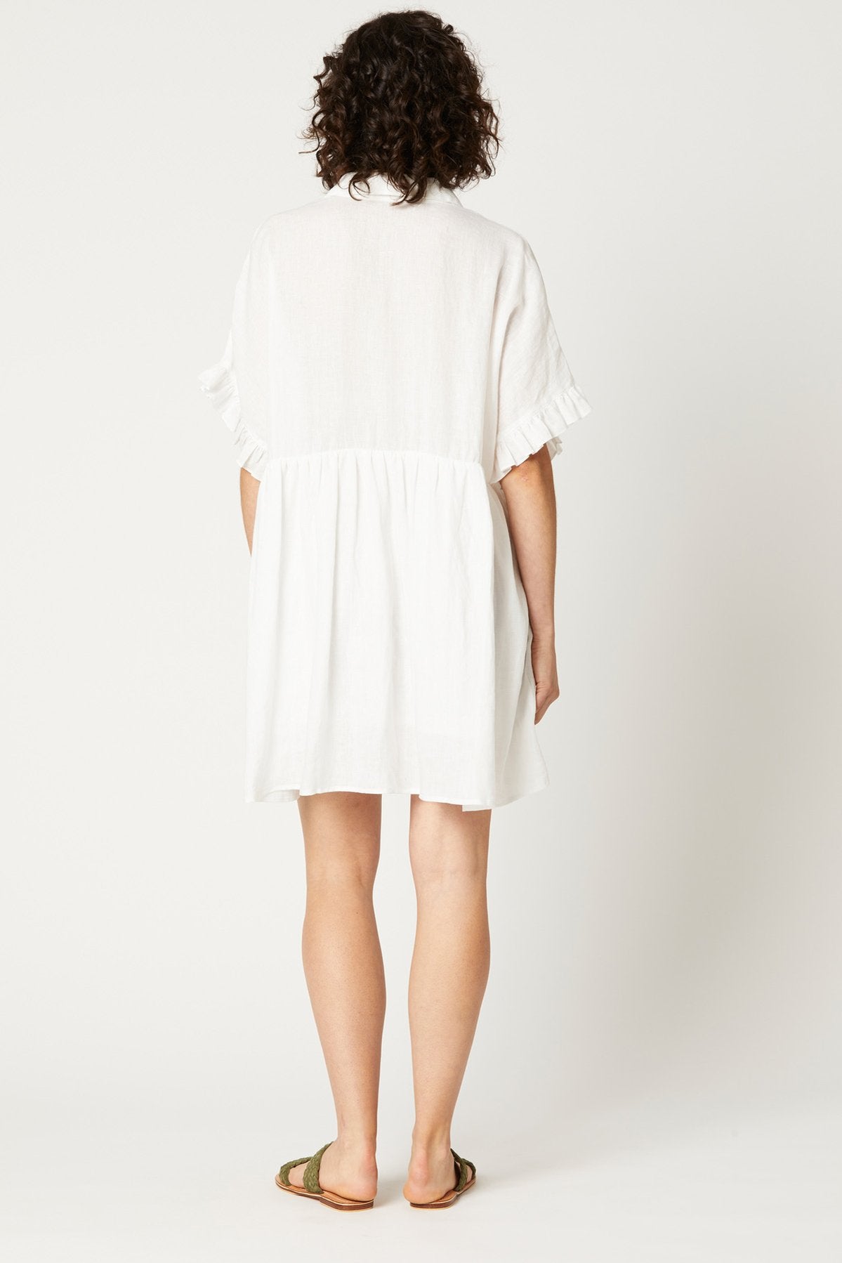 Crafted from 100% linen, the Nala Shirt Top/Dress is fully lined and designed with comfort, versatility, and flare in mind! The one-sized relaxed fit is inclusive of most body types. This button-down shirt style top/dress is single-tiered and features a collar and mid-length ruffled sleeves.
