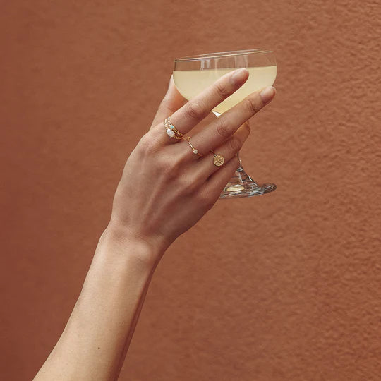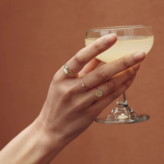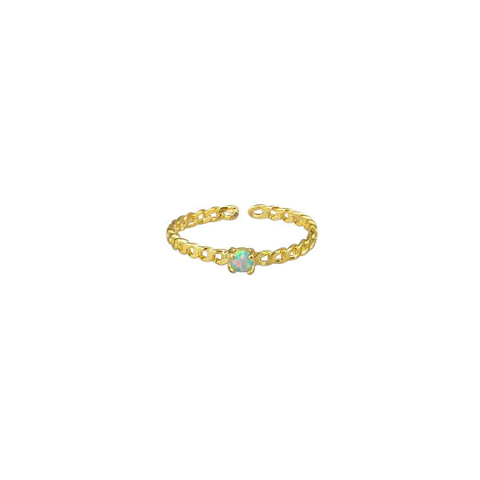 The Nova Rings has a thin chain band with small faux green opal. It is a petite style perfect for stacking with your favourite gold rings.