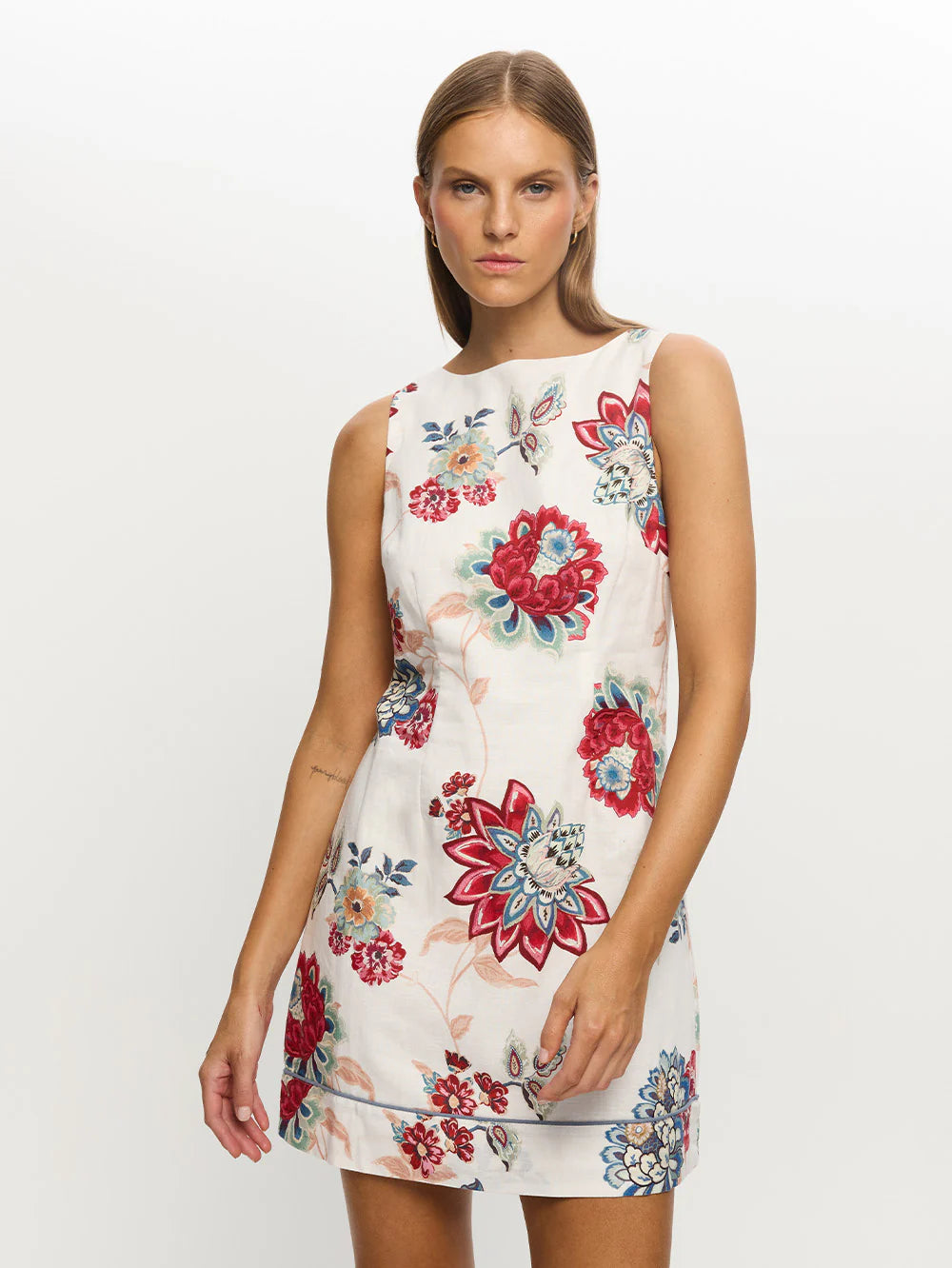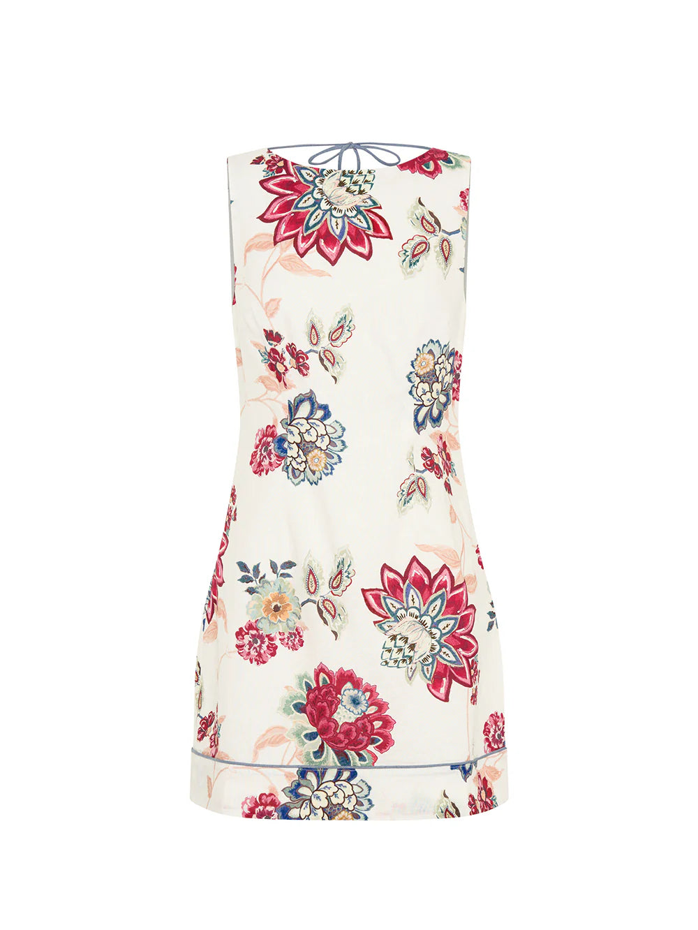 Provence is intricate red and blue florals on a soft white base. The Provence Mini Dress features a high boat neckline with back ties, complete with contrast blue detailing at hem.