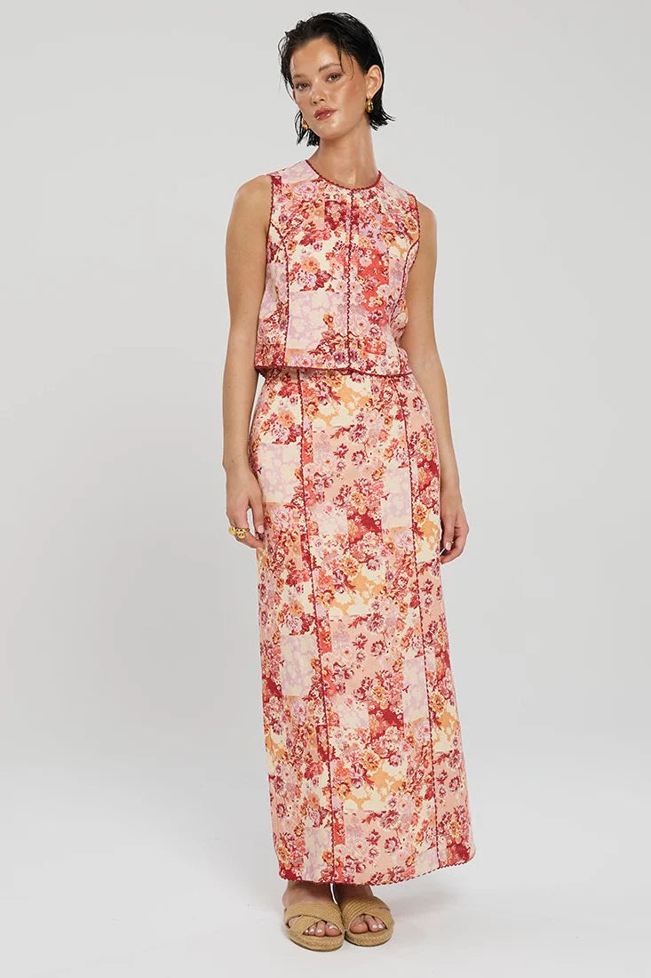 Winona Skirt is cut in an exclusive red-and-pink patchwork floral print on