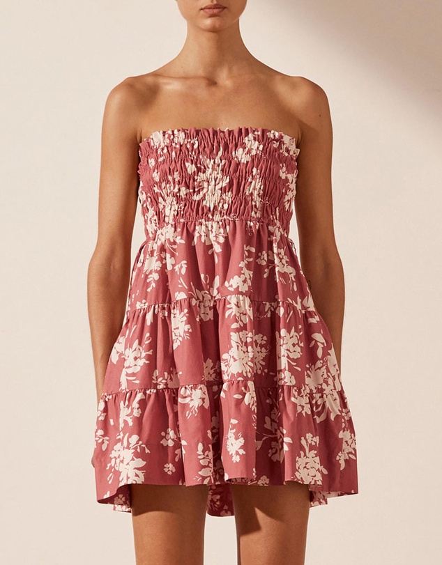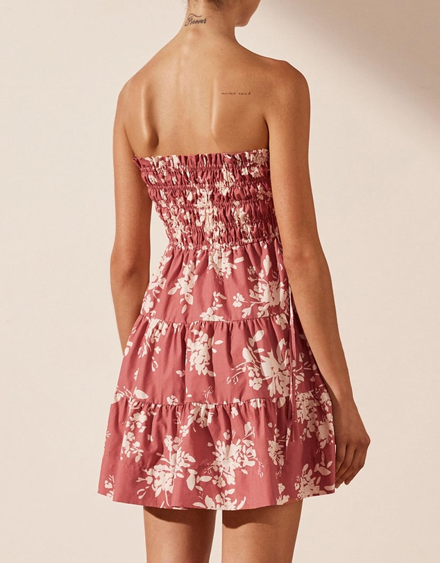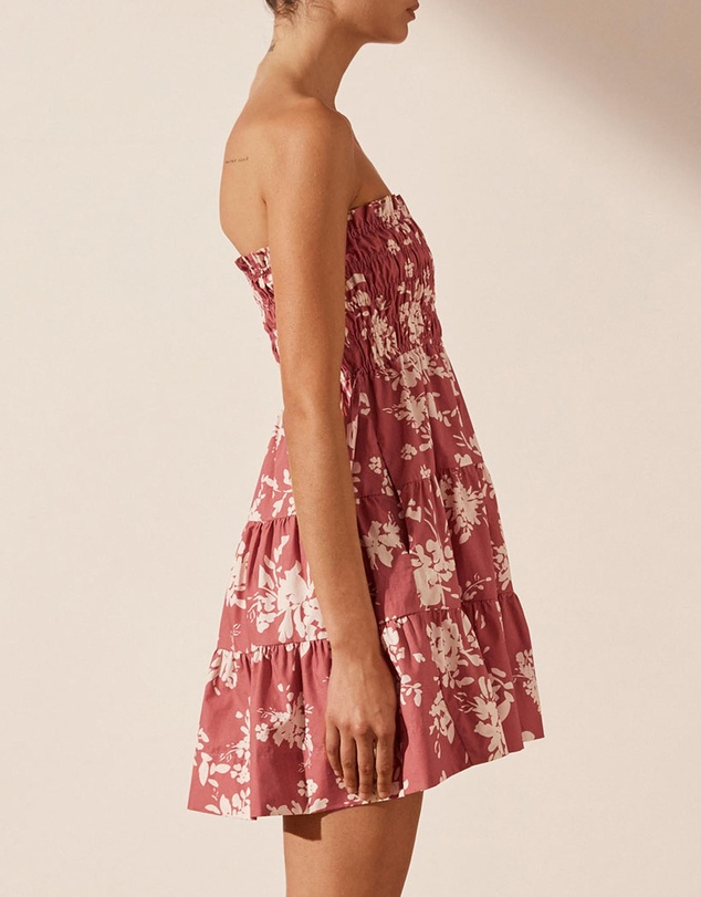 Strapless shirred mini dress in the exclusive Cali print in a GOTS certified organic cotton.