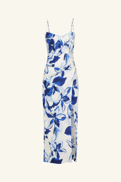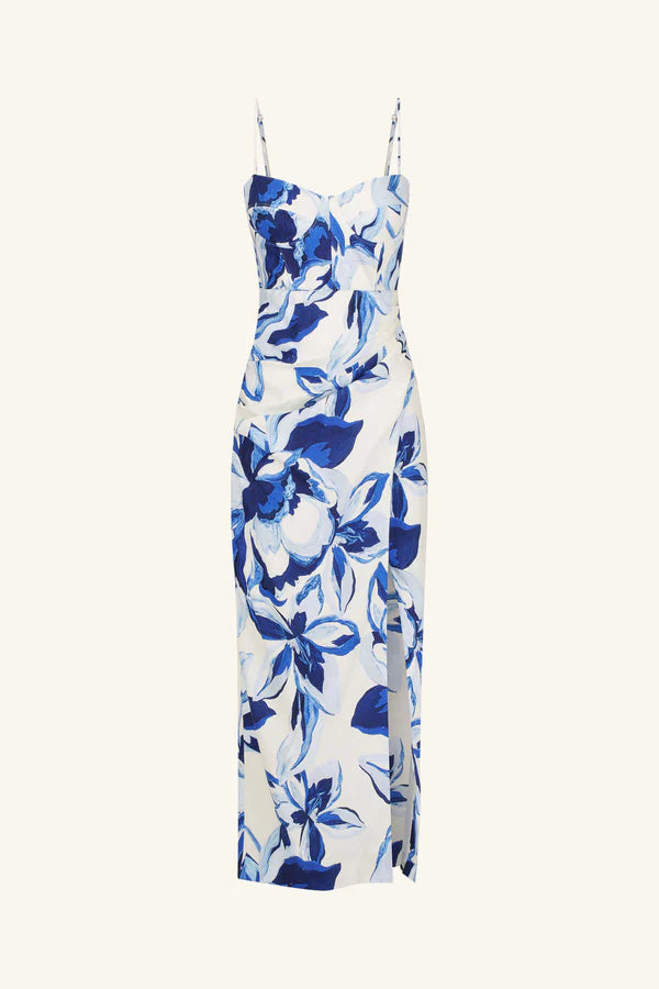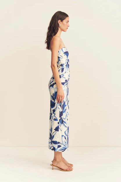 Bustier draped midi dress in the bluebell wallpaper print in a premium stretch linen blend.