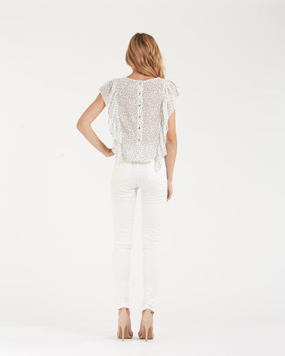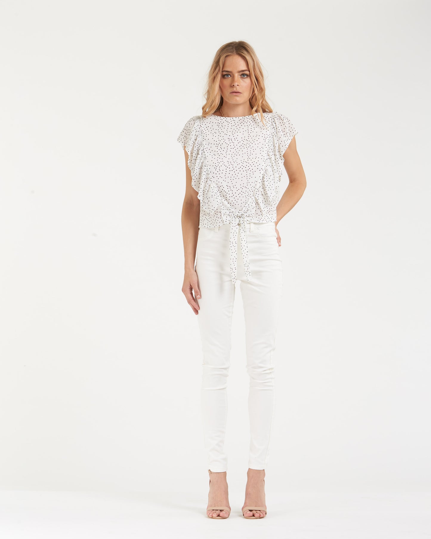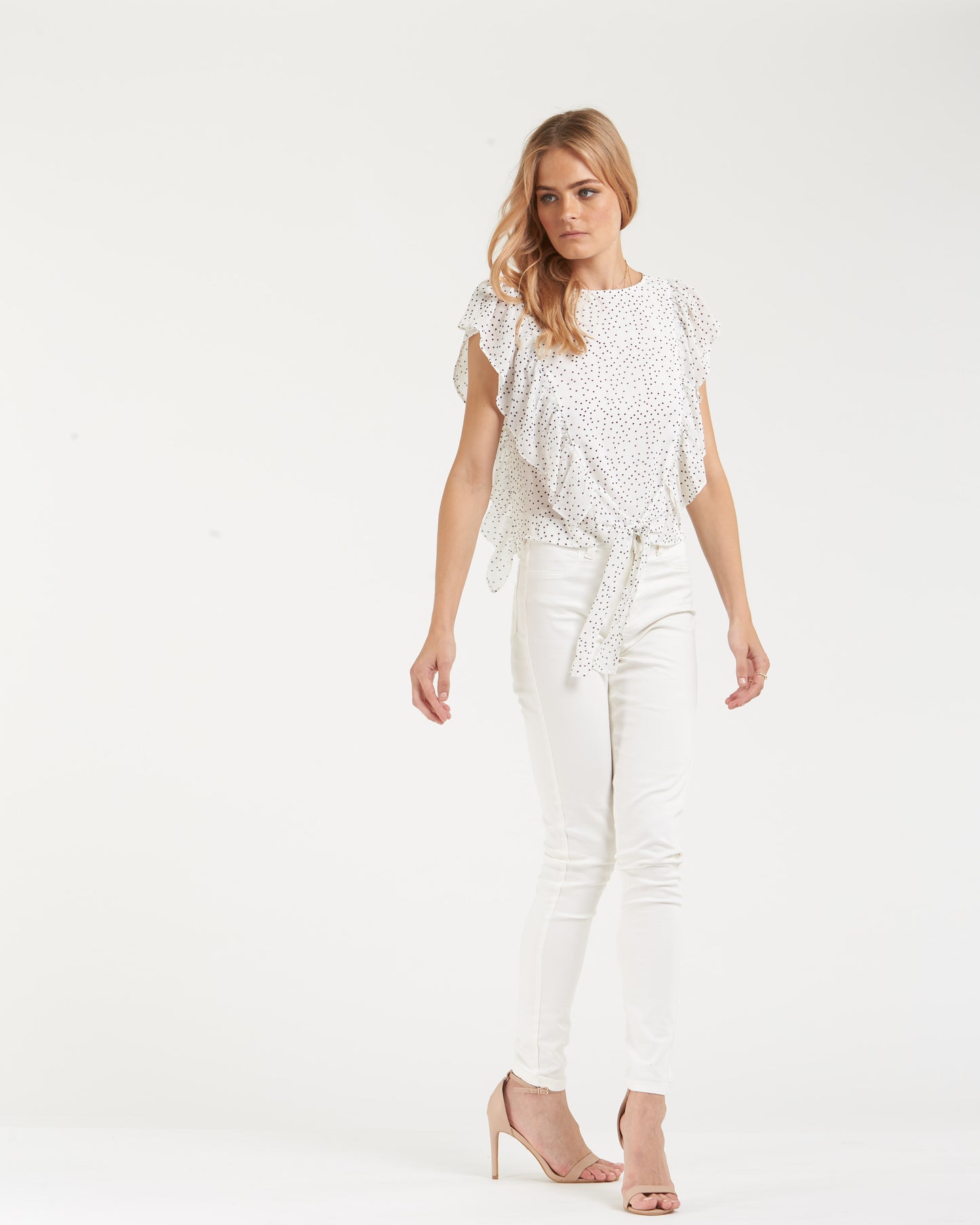The Spotty Dotty Top by Sydney based label Amelius is best described as timeless yet trendy. The piece is styled with ruffles fanning over the body to frame your arms. Paired with a midi skirt or pant and this polka dot number can easily be your new wardrobe staple.