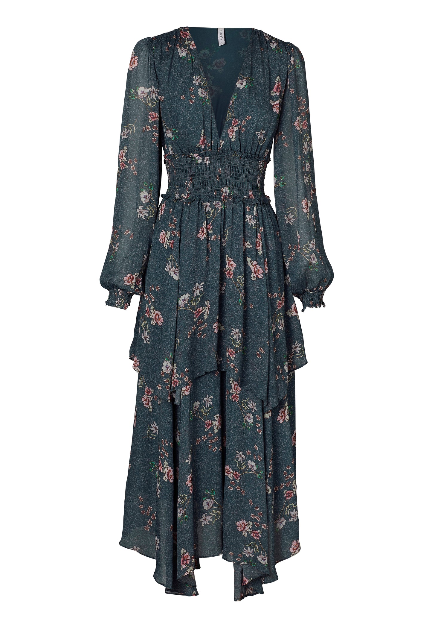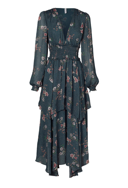 This feminine midi dress is delivered in an exclusive ‘Dreamfields’ Print. It has a soft gathering through bust finishes at shirred waistband for wearers comfort. The 2 tier skirt has small gathers ending at uneven hemlines. It has gathered balloon sleeves that are finished with shirred cuff.