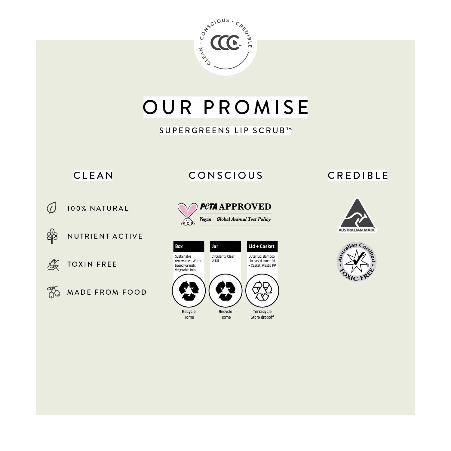 The Supergreens Lip Scrub is packaged mindfully in a recycled box with water-based varnishes and vegetable inks, recyclable glass jar and bio-based bamboo lid with plastic inner lining. We’re doing our best to balance keeping your products safe and sealed with the need reduce plastic use, landfill and our carbon footprint. To make the packaging in this product even better, we’re working on a lid with parts that can be separated and placed in home recycling.