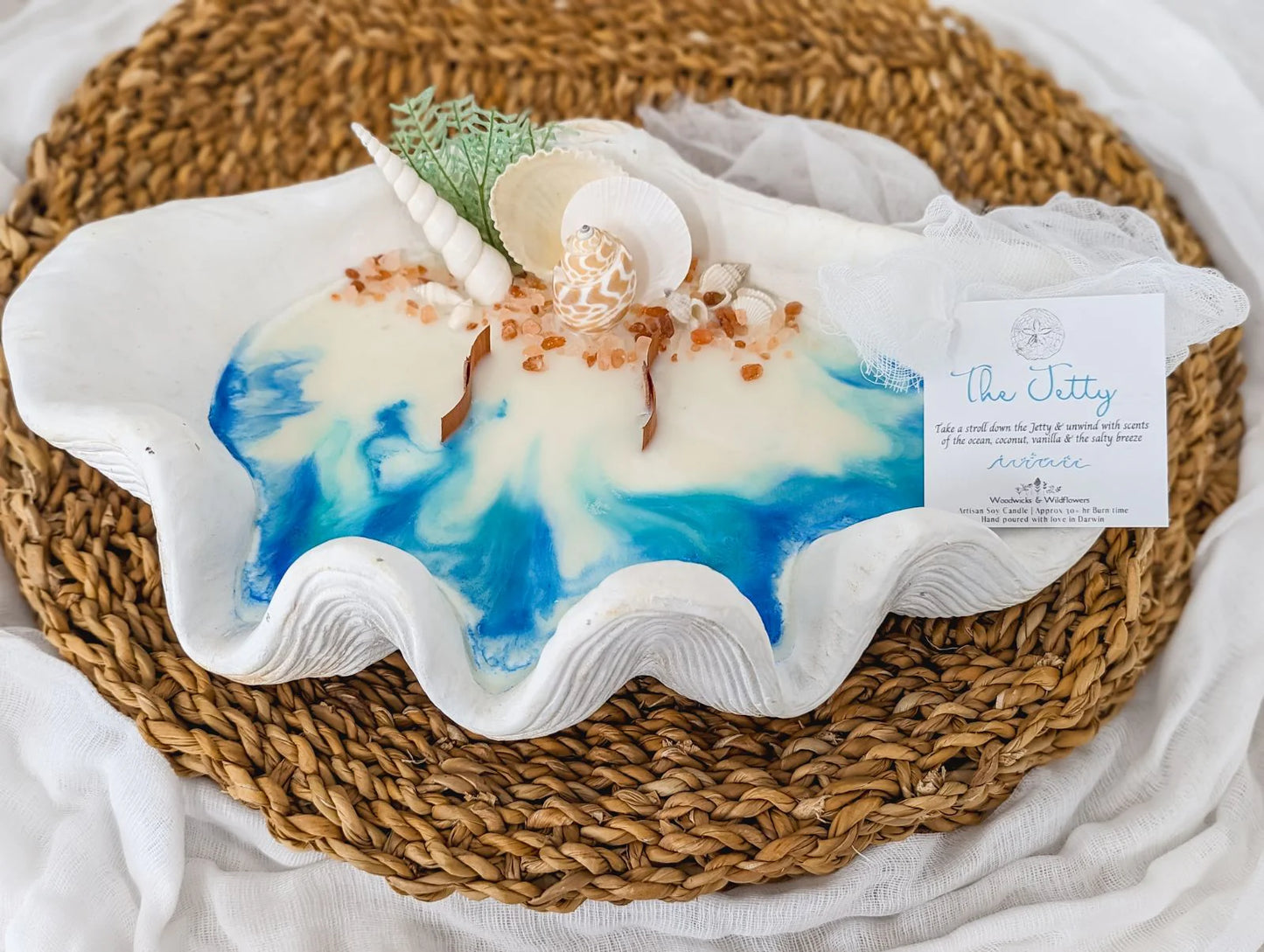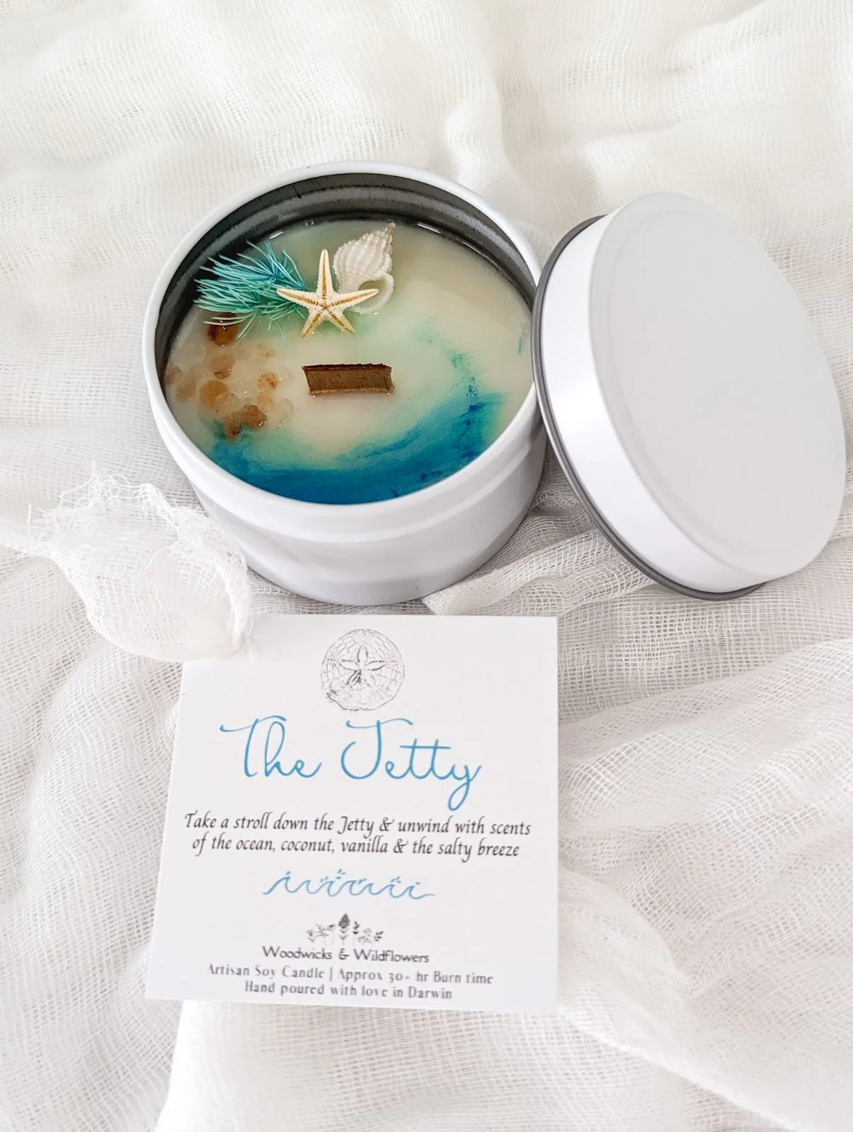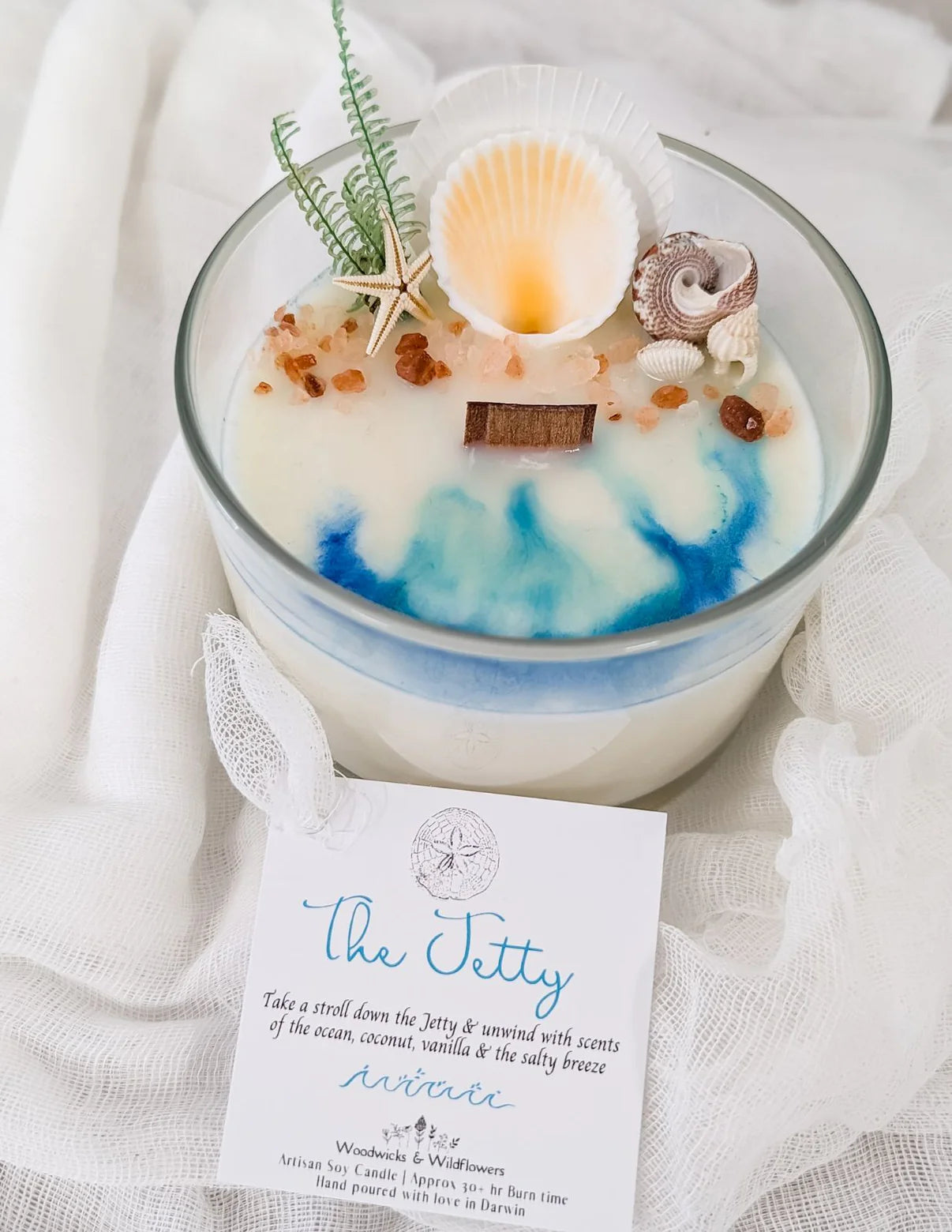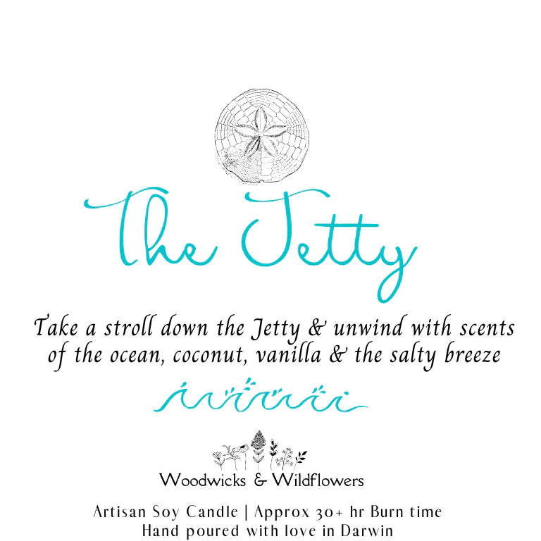 The Jetty Candle is a handcrafted artisan coconut soy candle that comes in a white ceramic bowl and is wrapped in muslin, making it the perfect gift for any occasion. It features a wood wick that creates a soothing crackling sound as it burns, transporting you to the peaceful seaside where you can relax and unwind with the scents of ocean, coconut, vanilla, and salty breeze. This candle makes a great addition to any room or outdoor space.