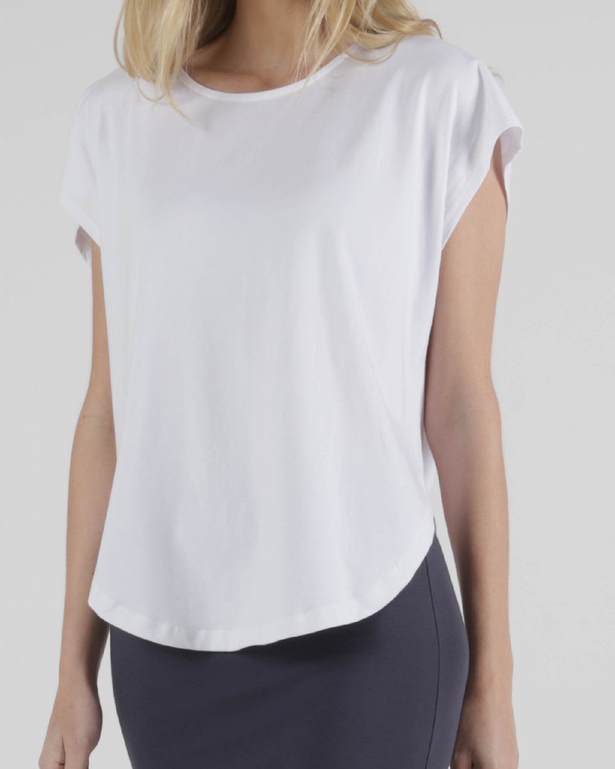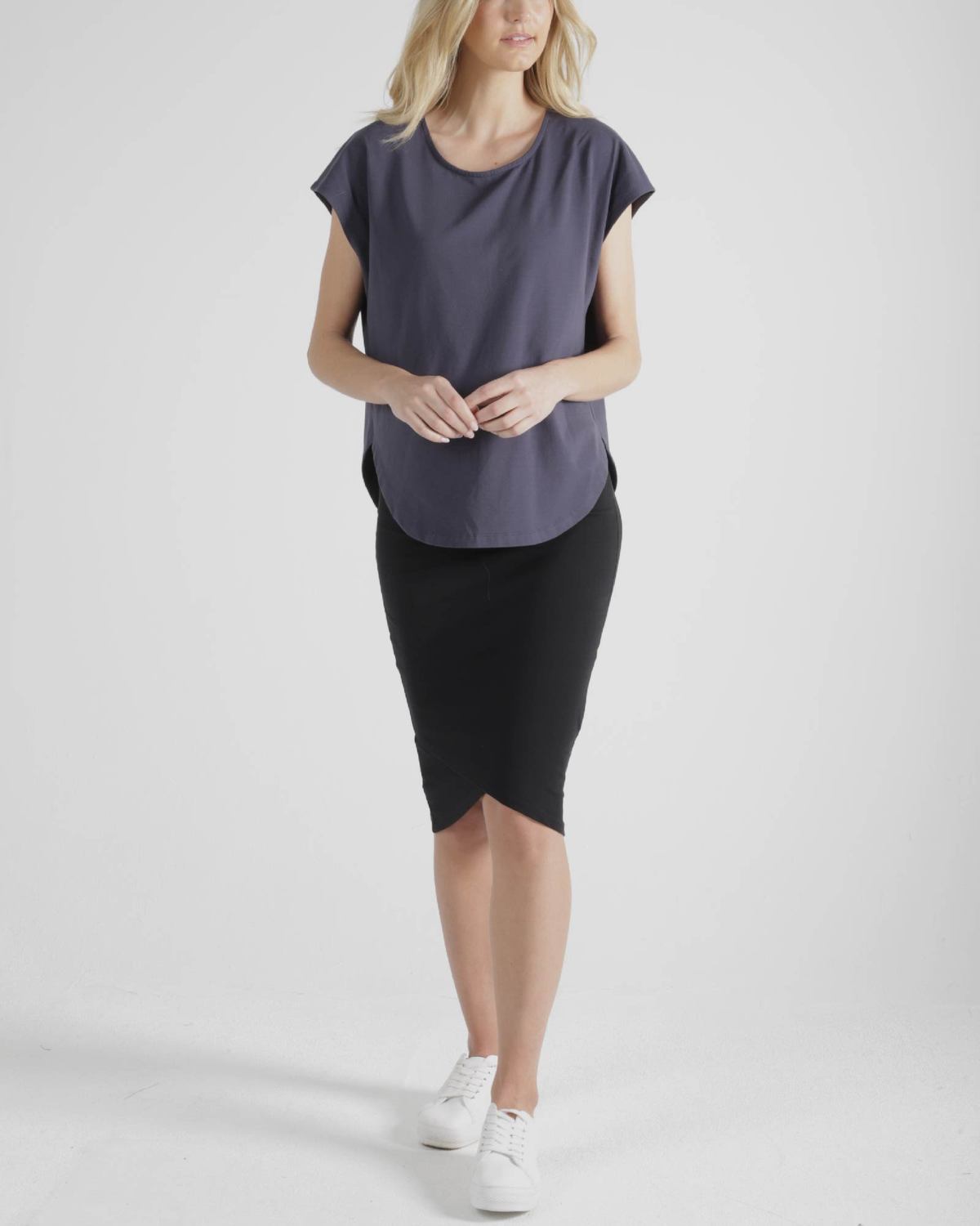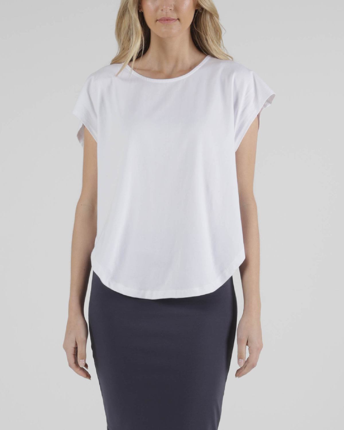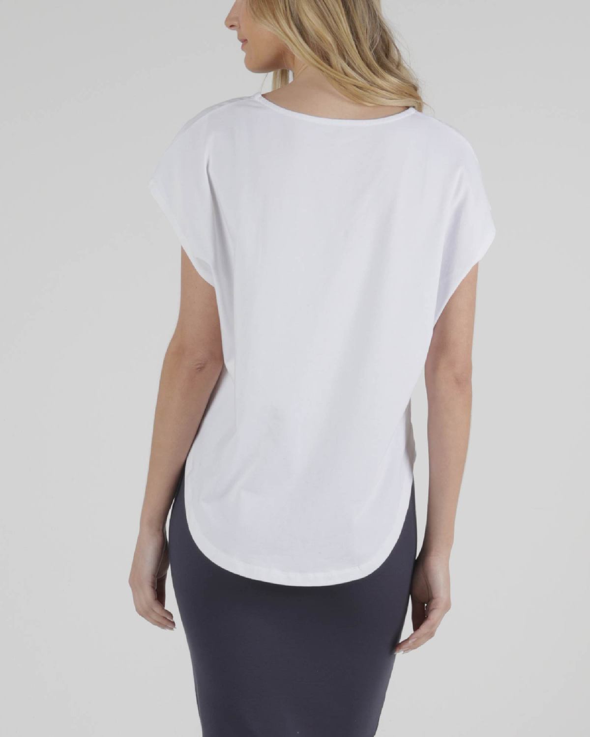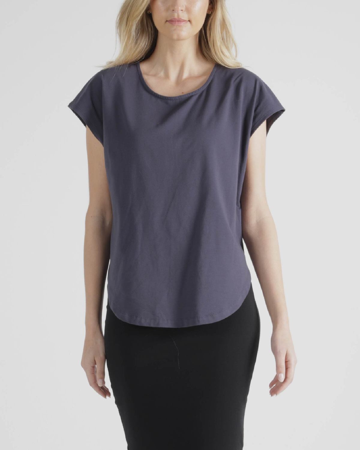The flattering scooped hemline and curved neck is flattering for all body shapes. Can be easily paired with a variety of skirts, pants and shorts.