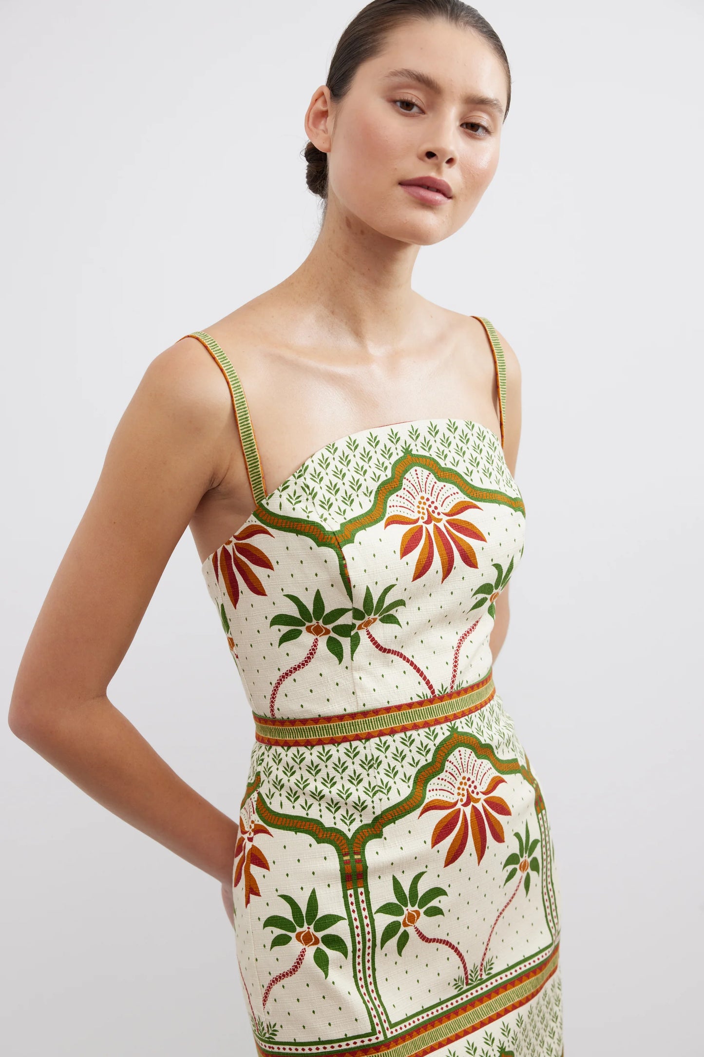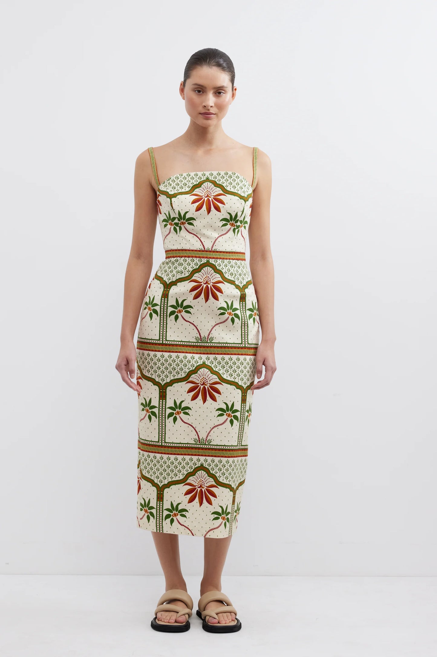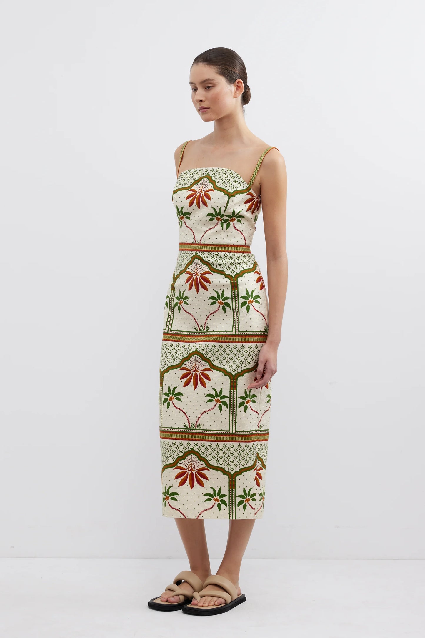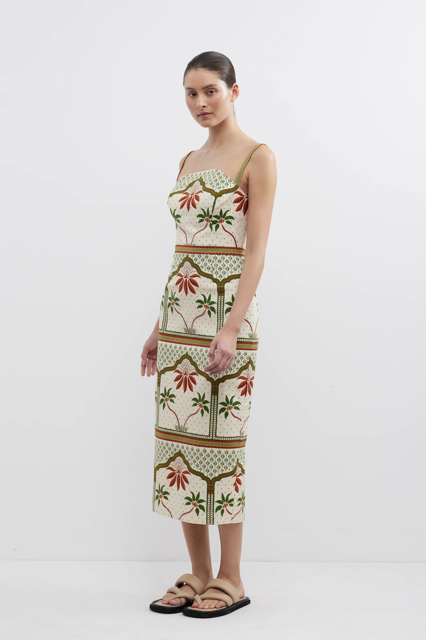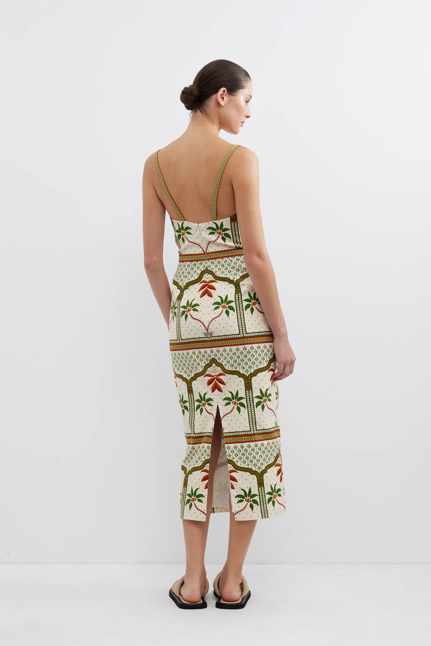 The Vida Midi by PASDUCHAS features an exclusive print set against a stretch dobby fabric with enzyme wash finish. Sitting firmly through the rounded cut bodice and suspended by barley there straps. The column silhouette then dominates skimming the hip before falling to the long length midi.